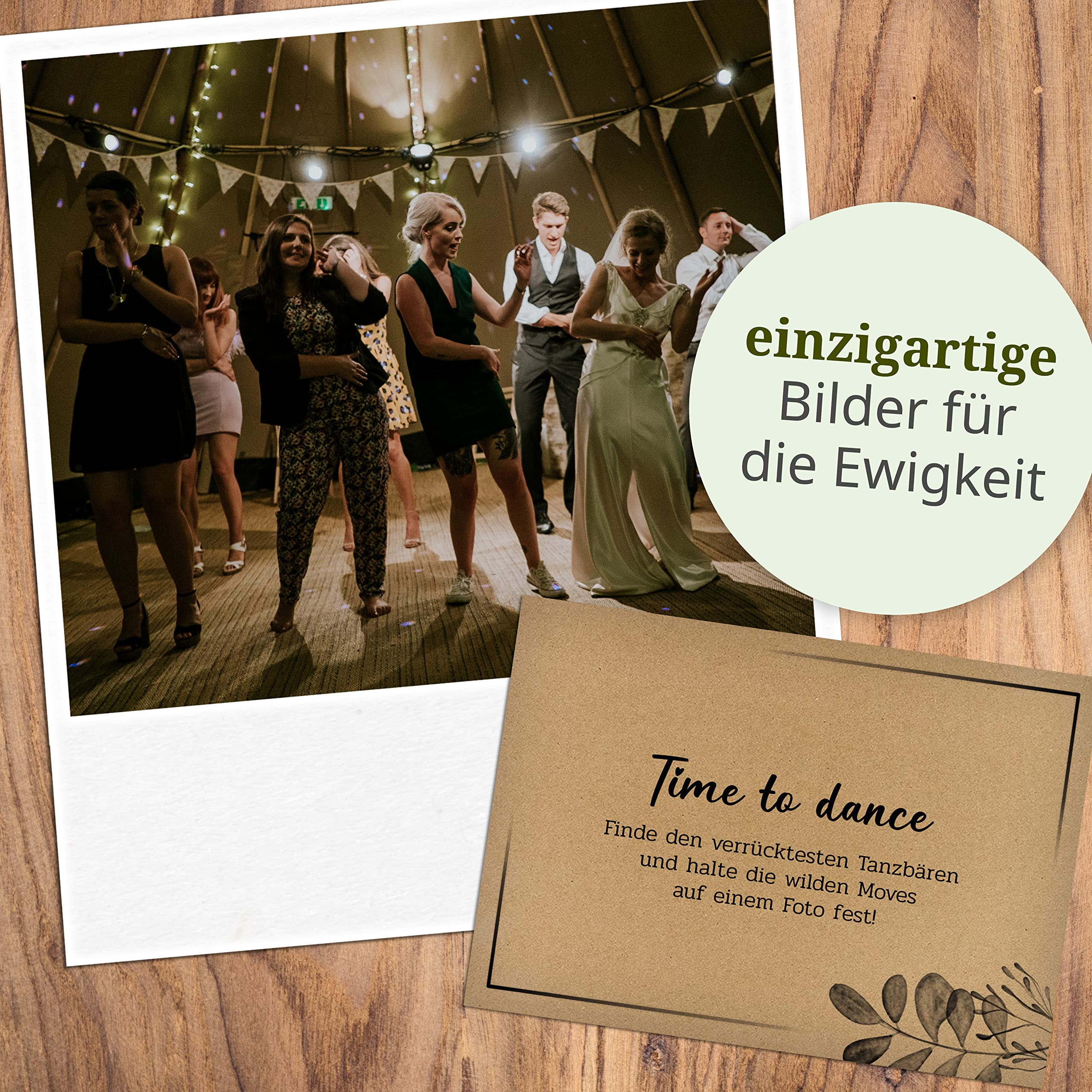 Mach deine Hochzeit zu einem unvergesslichen Erlebnis! Dieses Set mit 100 Fotoaufgaben und 5 beschriftbaren Karten sorgt für beste Unterhaltung unter den Gästen. Die stabilen Karten im eleganten Design passen perfekt zur Hochzeitsdeko. Einfach verteilen oder neben der Fotobox platzieren - so entstehen lustige Fotos und bleibende Erinnerungen fürs Hochzeitsalbum. Einfach, aber genial!