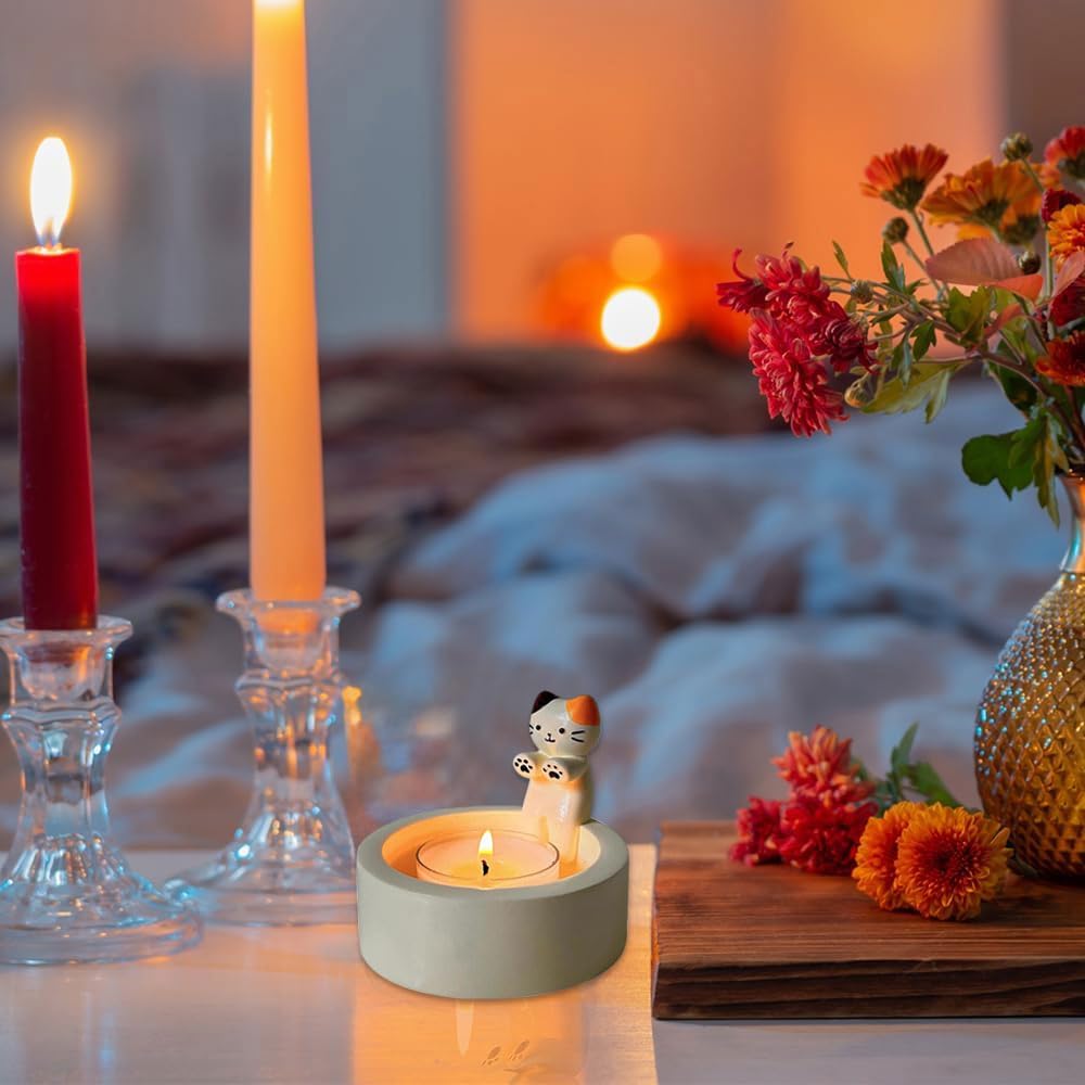 Oh, wie niedlich! Dieser Katzen-Kerzenhalter aus hochwertigem Harz ist einfach unwiderstehlich. Die kleine Katze wärmt sich mit ihren Pfötchen an der Kerze - ein Design, das einfach gute Laune macht! Aus robustem Harz gefertigt, ist der Kerzenständer langlebig und stabil. Er passt perfekt auf den Couchtisch, Nachttisch, Bücherregal oder Kaminsims und verbreitet sofort eine gemütliche Atmosphäre. Ob im Wohnzimmer, Schlafzimmer oder Büro - überall sorgt er für Charme und Wärme. Perfekt für Katzenliebhaber und alle, die es gemütlich mögen. Ein tolles Geschenk für Geburtstage, Weihnachten oder einfach mal so als Aufmerksamkeit. Die weiße Farbe passt zu jedem Einrichtungsstil und die Kerze in Standardgröße brennt sicher in dem Halter. Einfach die Kerze anzünden und den beruhigenden Schein genießen - das ist pure Gemütlichkeit für Zuhause! Ein Must-Have für alle, die Katzen lieben und es sich gerne behaglich machen.
