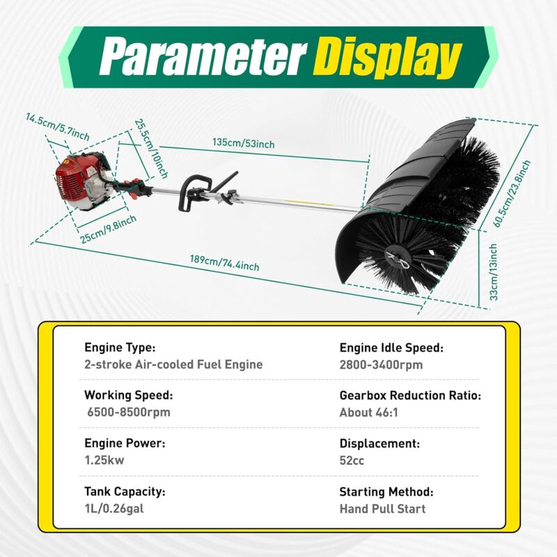 Wow, mit diesem Benzin-Kehrmaschine machst du richtig Dampf! Der 52CC 2-Takt Motor bringt satte 1.7kW Leistung und die 56cm Bürstenbreite fegen selbst große Flächen ratzfrei sauber. Besonders praktisch: Der ergonomische Griff liegt super in der Hand und der Schultergurt verteilt das Gewicht (nur 10kg!). Du kannst damit nicht nur Laub und Schmutz wegpusten, sondern im Winter auch Schnee räumen. Die Geschwindigkeit ist stufenlos regelbar (6500-8500 U/min) - perfekt für verschiedene Untergründe wie Kunstrasen, Beton oder Gehwege. Start per Zugstarter, und die gebogene Schallwand schützt vor aufwirbelnden Steinchen. Inklusive Schutzbrille, Trichter und Mischflasche für Benzin-Öl-Gemisch (25:1). Ein echter Profi-Helfer für Garten, Hof und Straße!