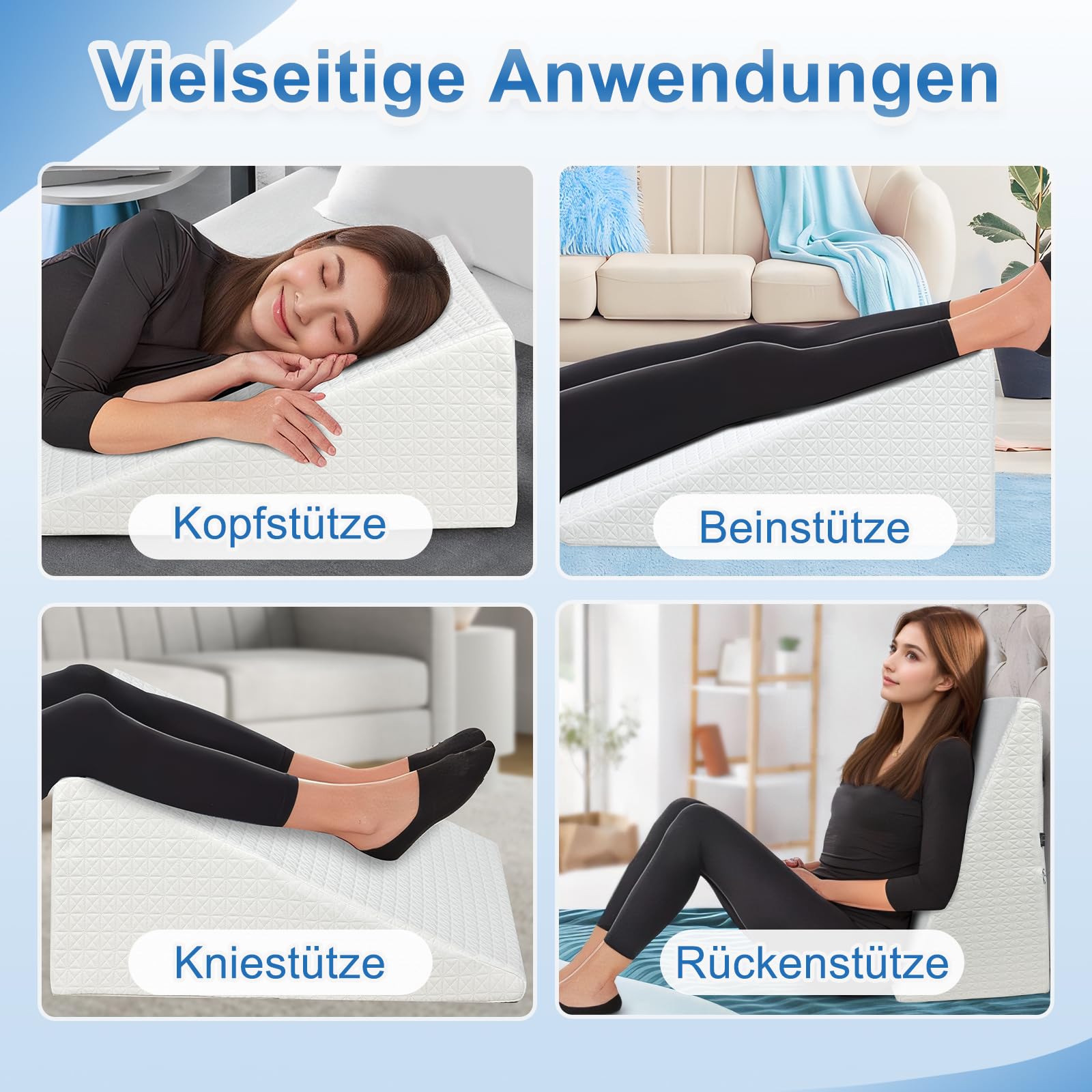 Das vielseitigste Kissen ever! Aus hochwertigem Memory-Schaum, der sich perfekt an deinen Körper anpasst. Mit cleverem 27° Winkel für ideale Unterstützung - ob für Paare oder alleine. Lindert Druck an Hüften, Rücken und Beinen. Perfekt als Beinkissen, Rückenlehne oder Sitzkissen. Der hautfreundliche Bezug ist atmungsaktiv und abnehmbar zum Waschen. Leicht und tragbar - nutze es im Wohnzimmer, Schlafzimmer oder unterwegs. Für besseren Schlaf, entspanntes Fernsehen oder mehr Komfort beim Lesen. Ein Kissen für alle Lebenslagen - dein neuer bester Freund für Entspannung und Wohlbefinden!