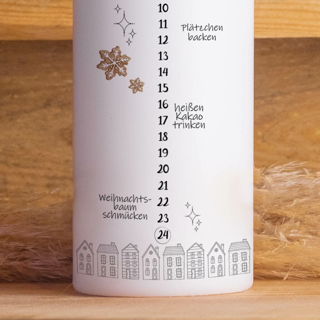 Einfach aufstellen, anzünden und täglich ein Stück genießen. Eine wunderschöne Tradition für die ganze Familie. Aber Vorsicht: Niemals unbeaufsichtigt brennen lassen und immer auf feuerfeste Unterlage stellen!