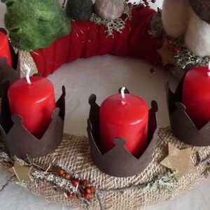 Vintage-Charme für Ihre Adventszeit! Dieses bezaubernde Set mit 4 Kerzensteckern im trendigen Rost-Look verleiht Ihrem Adventskranz ganz besonderen Flair. Aus robustem Metall gefertigt, überzeugen die Halter durch ihre authentische Antiquität-Optik. Mit ca. 12 cm Gesamthöhe und 10 cm Durchmesser passen sie perfekt für Stumpenkerzen von 5-9 cm Durchmesser. Das kronenförmige Design fügt sich wunderbar in jeden rustikalen oder industrialen Einrichtungsstil ein. Einfach die Kerzen in die Halter stecken und auf dem Adventskranz arrangieren - schon entsteht eine gemütliche, festliche Atmosphäre. Perfekt nicht nur für Weihnachten, sondern auch für romantische Dinner oder winterliche Dekorationen. Ohne Dekoration geliefert - so haben Sie maximale Gestaltungsfreiheit für Ihre individuelle Kreation. Kombinieren Sie sie mit Tannenzweigen, Beeren und Bändern für einen perfekten Vintage-Adventskranz, der Ihre Gäste begeistern wird! Weihnachtsstimmung garantiert!