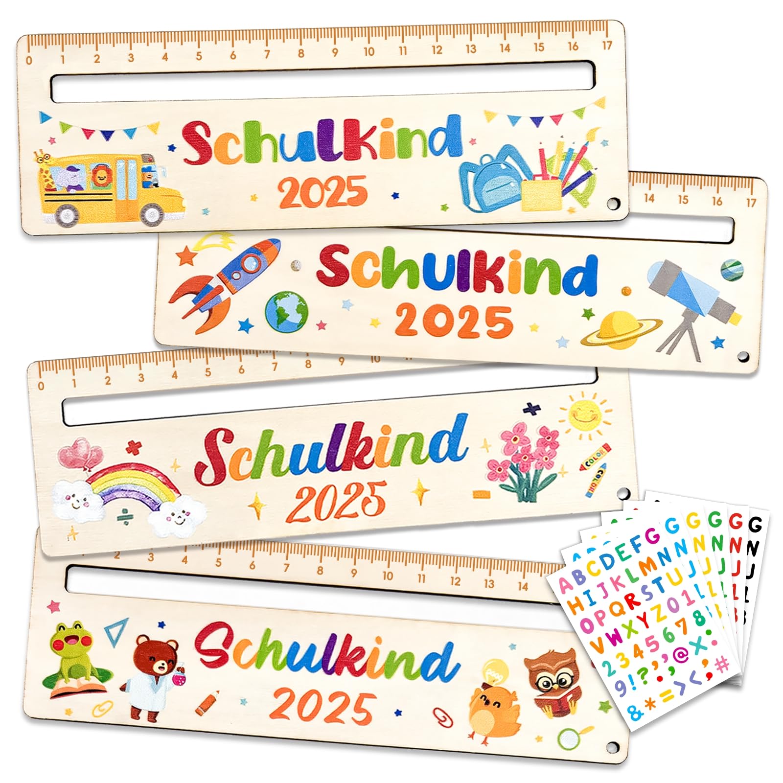 Lesen lernen war noch nie so einfach! Diese 4 bunten Leselineale aus Holz helfen Erstklässlern, nicht die Zeile zu verlieren. Mit dem praktischen Lesefenster können Kinder sich voll auf eine Zeile konzentrieren - kein Springen mehr zwischen den Zeilen! Die süßen Motive mit Schulbus, Rakete und Eule machen Lust aufs Lernen. Inklusive 6 Aufkleber-Sets mit Buchstaben, Zahlen und Satzzeichen zum Personalisieren. Aus robustem Holz gefertigt, halten die Lineale auch wildem Schulalltag stand. Perfekt als Geschenk zur Einschulung, für die Schultüte oder einfach als praktische Lernhilfe für zu Hause. Ob als Lineal oder Lesehilfe - dieses Set ist ein echter Allrounder für kleine Leseratten und solche, die es noch werden wollen!