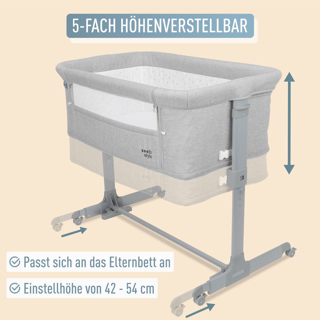 Hey, werdende Eltern! Dieses umbaufähige Kinderbett ist echt praktisch - es wächst einfach mit eurem Kind mit. Aus massivem Kiefernholz mit speichelfestem Lack, also absolut kindersicher. Mit 120x60 cm ist es die perfekte Größe als Beistellbett direkt neben eurem Bett. Das Coole: Es lässt sich später ganz easy zum richtigen Kinderbett umbauen, das bis zum 4. Lebensjahr nutzbar ist. Der Lattenrost ist 8-fach höhenverstellbar (zwischen 30-60 cm), sodass ihr die Matratzenhöhe perfekt anpassen könnt. Die 4 Räder mit Bremsen sind super praktisch - einfach bewegen und fixieren. Mit dem 6 Meter langen Gurt befestigt ihr es sicher am Elternbett. Drei Sprossen am Seitenteil sind herausnehmbar, wenn das Kind größer wird. Alles entspricht den neuesten EU-Sicherheitsnormen - da könnt ihr beruhigt sein! Im Lieferumfang ist alles dabei: Bett mit Lattenrost, zusätzliche Gitterwand für den Umbau, die Räder und der Befestigungsgurt. Einfach aufbauen und sich über dieses vielseitige Bett freuen, das euch jahrelang begleitet!