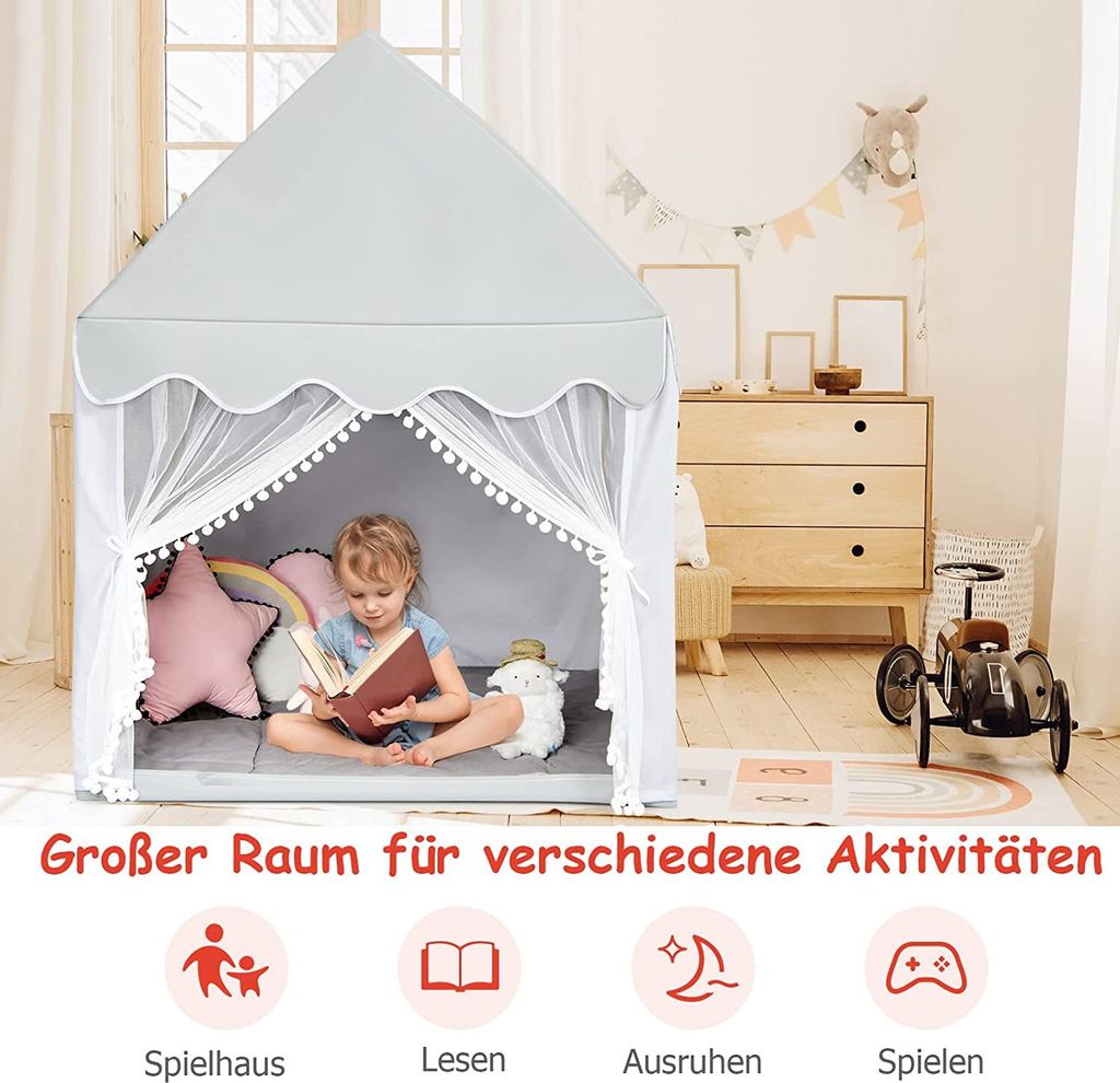 Ein magisches Reich für kleine Träumer! Dieses bezaubernde Prinzessinnenzelt (120x105x128cm) verwandelt jedes Kinderzimmer in eine Fantasiewelt. Mit süßen Schmetterlingen und bunten Wolkenanhängern dekoriert - direkt einsatzbereit! Aus stabilem Polyester mit Metallstangen, einfach aufzubauen ohne Werkzeug. Tür und zwei Fenster sorgen für Luftzirkulation. Platz für 2-3 Kinder - perfekt für Rollenspiele, Leseecken oder als gemütlicher Rückzugsort. Inklusive Aufbewahrungstasche für platzsparende Lagerung. Für Jungen und Mädchen ab 3 Jahren. Ein Geschenk, das Kinderaugen zum Leuchten bringt!