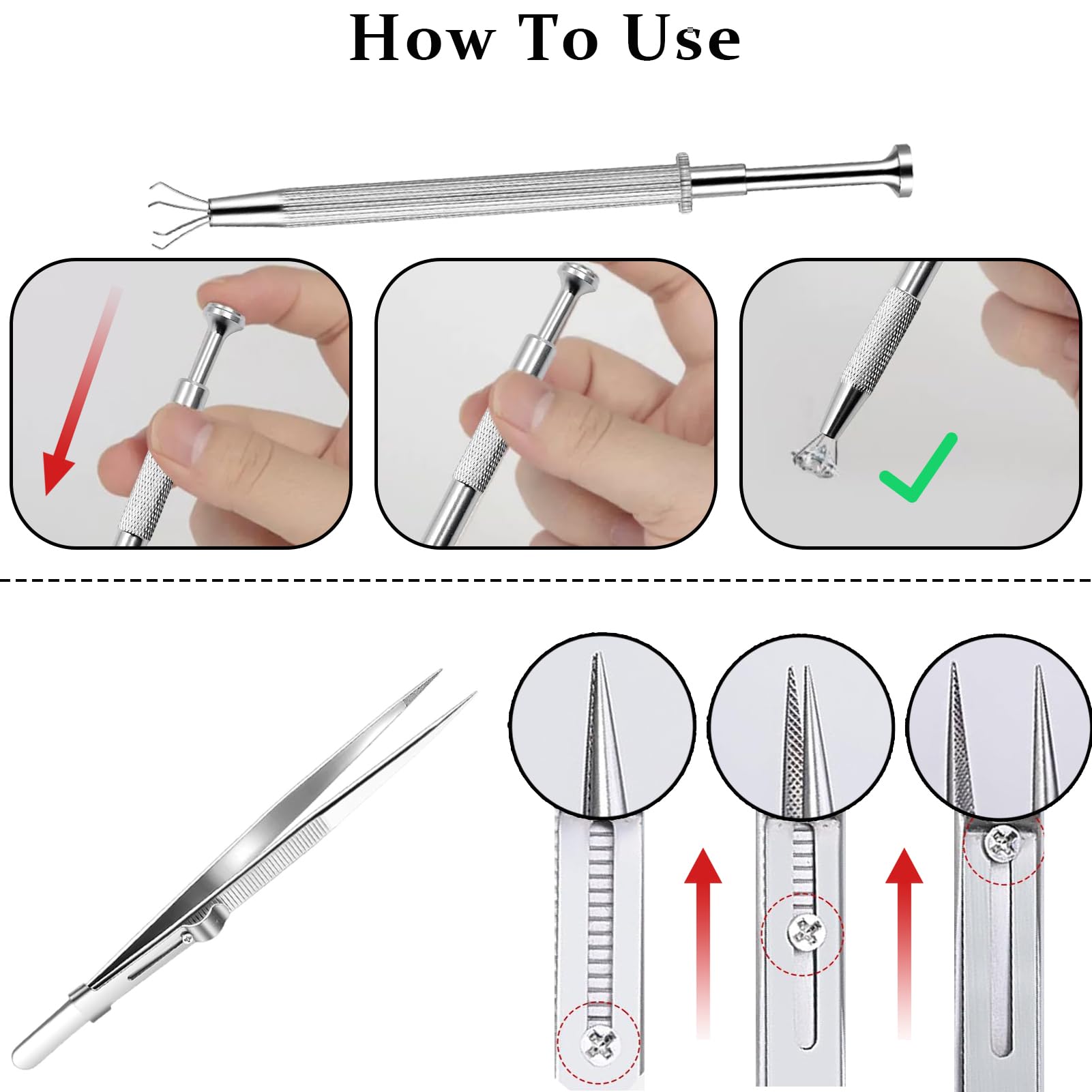 Diese Greifzangen sind echte Alleskönner! 3 Stück im Set, jeweils mit 4 Backen für super präzises Greifen. Aus rostfreiem Edelstahl - langlebig und hygienisch. Perfekt für Piercing-Kugeln, Schmucksteine, Diamanten, aber auch für Elektronik-Teile wie IC-Chips oder winzige Schrauben. Die Feder-Mechanik macht das Greifen super einfach: Drücken, greifen, loslassen. Rutschfeste Oberfläche für sicheren Halt. Ob für Hobby, Handwerk oder Reparaturen - diese Zangen erleichtern die Arbeit mit kleinen Teilen ungemein!