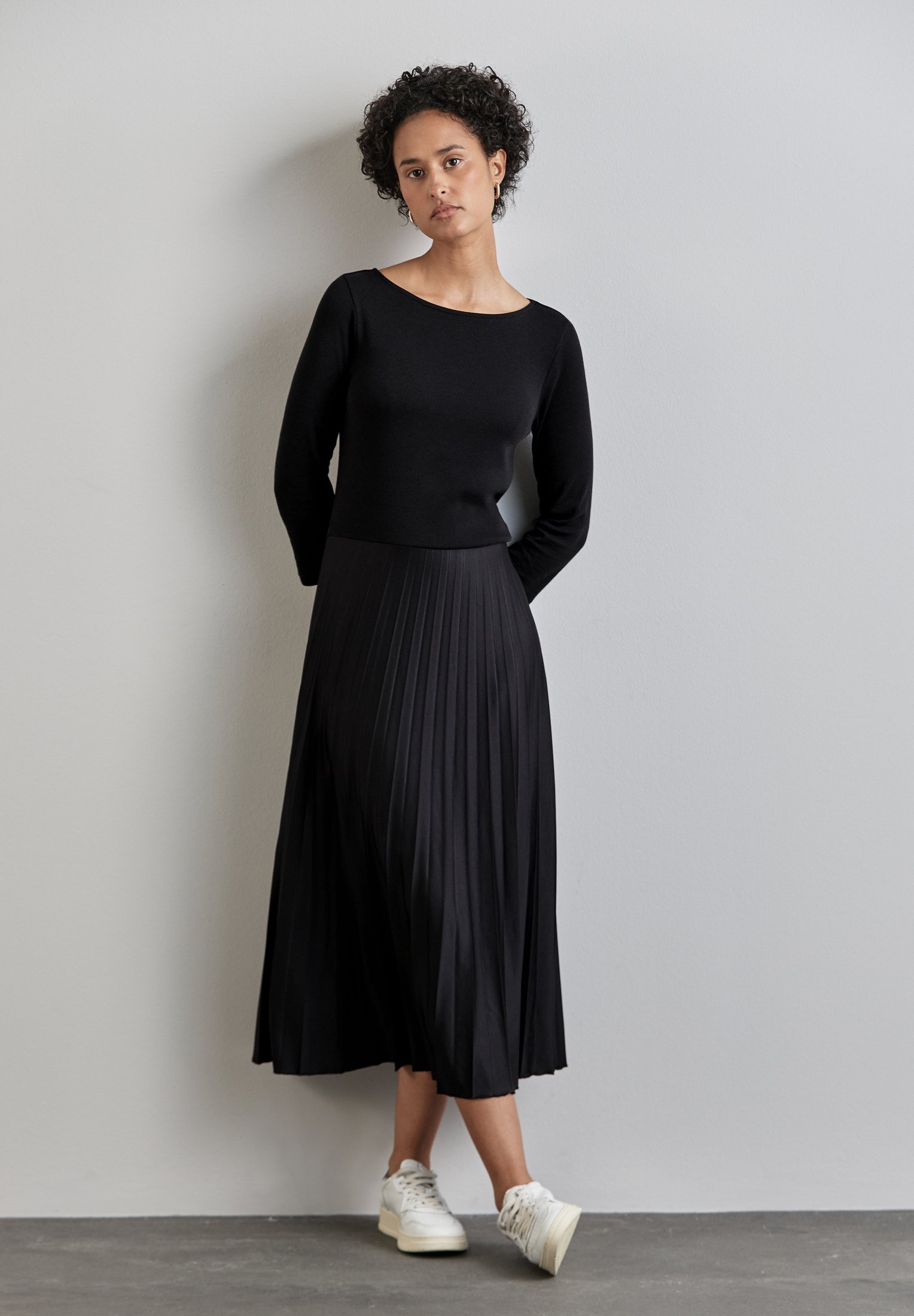 Wow, dieses Street One Kleid ist ja mal richtig stylisch! Der Material-Mix ist der Hit: Oberteil aus softem Ripp-Stoff und der Rock in weichem Plissée - sitzt super schmeichelhaft! Midi-Länge - total angesagt und vielseitig kombinierbar. Mit U-Boot-Ausschnitt - betont deine Figur, ohne zu aufreizend zu wirken. Der Rock fällt weich und fließend - bewegt sich super mit dir! Angenehmer Tragekomfort - fühlt sich an wie ne zweite Haut! Perfekt für den Alltag, aber auch für besondere Anlässe geeignet. Ob zur Arbeit, zum Date oder auf ne Feier - damit bist du immer richtig angezogen! Street One Qualität - sitzt perfekt und hält was aus! Einfach anziehen und du siehst sofort gestylt aus - ohne groß rumzuprobieren! Wenn du mal was Besonderes suchst, das nicht jeder hat - hier ist es! Sieht aus wie von teurer Marke, ist aber erschwinglich!