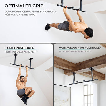 Baue Muskeln zu Hause ohne teures Fitnessstudio! Diese HOMCOM Klimmzugstange montierst du einfach an der Wand und hast sofort dein persönliches Home-Gym. Mit 150kg Belastbarkeit hält sie auch intensiven Training stand.\\n\\nTechnische Daten:\\n• Maße: 93,5cm breit, 65cm hoch, 17cm tief\\n• Belastbarkeit: 150kg - für die meisten Sportler\\n• Material: Hochfester Stahl\\n• Stärke: 1,5mm Wandstärke\\n\\n3 Griffpositionen für volles Training:\\n• Breiter Griff - für breiten Rücken\\n• Neutraler Griff - schonend für Schultern\\n• Enger Griff - für Trizeps und Unterarme\\n\\nZusätzliche Features:\\n• 3 Dip-Ösen für Zusatzübungen\\n• Kann als Sandsackaufhänger genutzt werden\\n• Rutschfeste Griffe für sicheren Halt\\n• Dreieckige Stützstruktur für maximale Stabilität\\n\\nEinfache Montage an der Wand:\\nMit 8 Schwerlastdübeln wird die Stange bombenfest. Such dir eine freie Wandstelle und in 30 Minuten bist du startbereit.\\n\\nTraining für den ganzen Oberkörper:\\n• Klimmzüge für Rücken und Arme\\n• Dips für Brust und Trizeps\\n• Beinheben für Bauchmuskeln\\n• Verschiedene Griffvarianten\\n\\nPlatzsparendes Design:\\nDie Stange ragt nur 17cm von der Wand - perfekt auch für kleine Räume. Wenn du nicht trainierst, fällt sie kaum auf.\\n\\nLieferumfang komplett:\\n• 1x Klimmzugstange\\n• Montagematerial\\n• Ausführliche Anleitung\\n\\nFür alle, die fit werden wollen ohne monatliche Studio-Kosten - diese Klimmzugstange ist dein Ticket zum muskulösen Oberkörper!