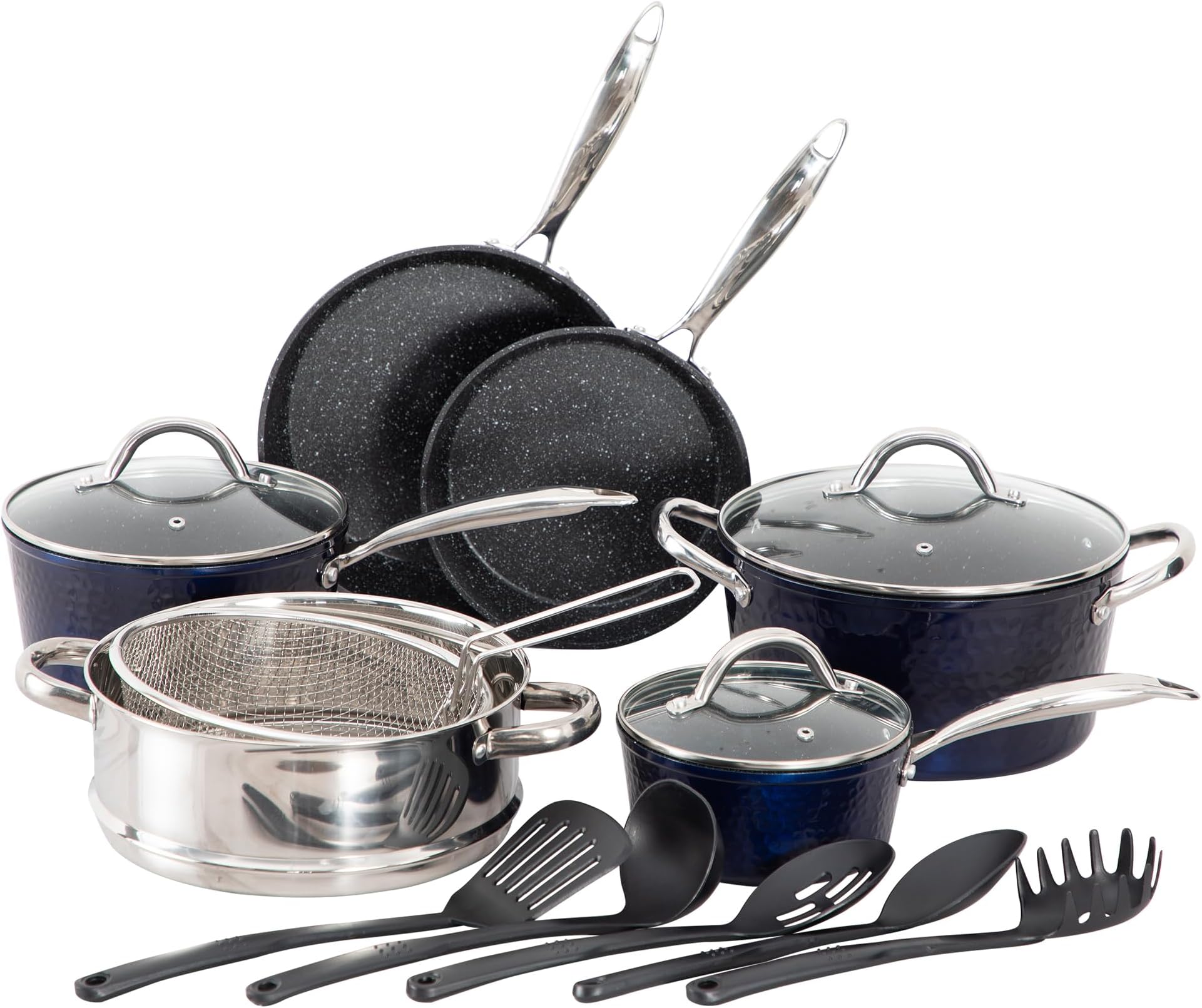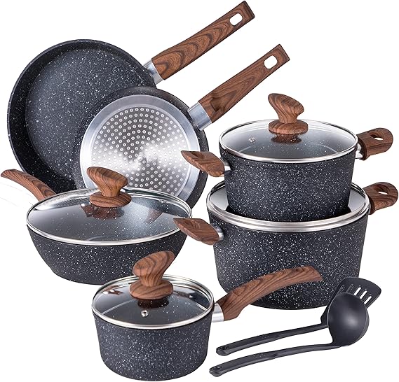 Komplettausstattung für deine Küche! Dieses 17-teilige Kochset hat wirklich alles, was du brauchst: Verschiedene Pfannengrößen (20-29 cm), Töpfe in 1,5-5 qt Größe und sogar Backformen. Die Granit-Beschichtung ist super antihaft und benötigt kaum Öl - perfekt für gesundes Kochen. Passt auf alle Herdarten inklusive Induktion! Die hitzebeständigen Bakelit-Griffe bleiben kühl und die Glasdeckel lassen dich reinschauen. 365 Tage Garantie gibt's obendrauf. Einziger Nachteil: Nicht spülmaschinenfest - aber das Putzen geht trotzdem leicht von der Hand. Für alle, die gerne kochen und Wert auf Qualität legen!