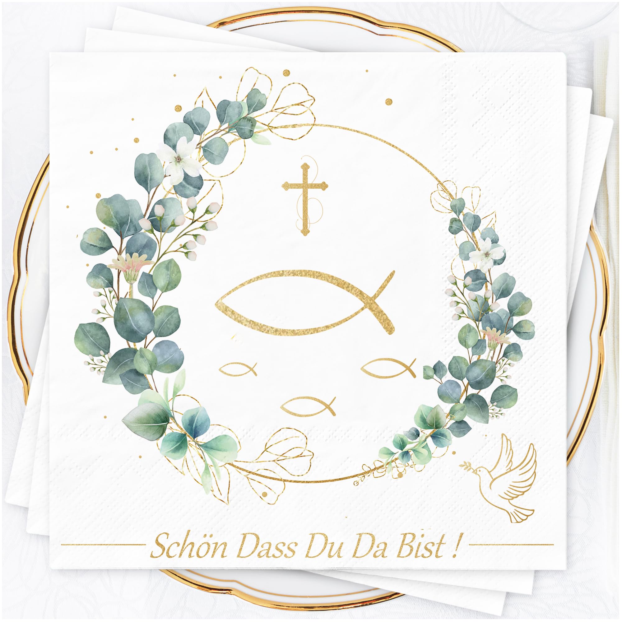 40 Servietten Taufe/Kommunion - Eukalyptus Design 33x33 Cm