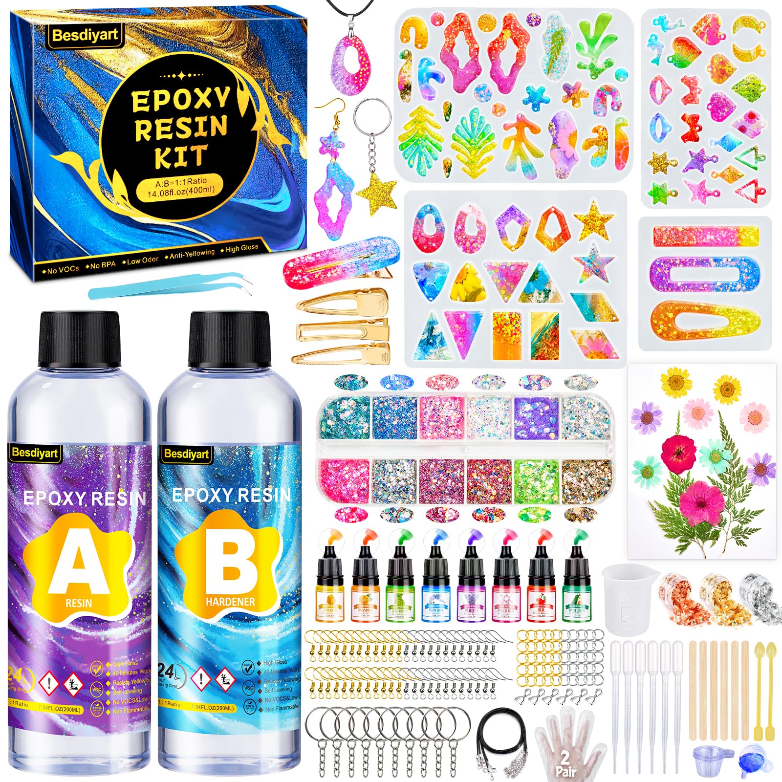 400ml Harz und Härter im perfekten 1:1 Verhältnis. Dazu 8 bunte Farben, Glitzer, Formen und alles Zubehör für Ohrringe, Anhänger und mehr.