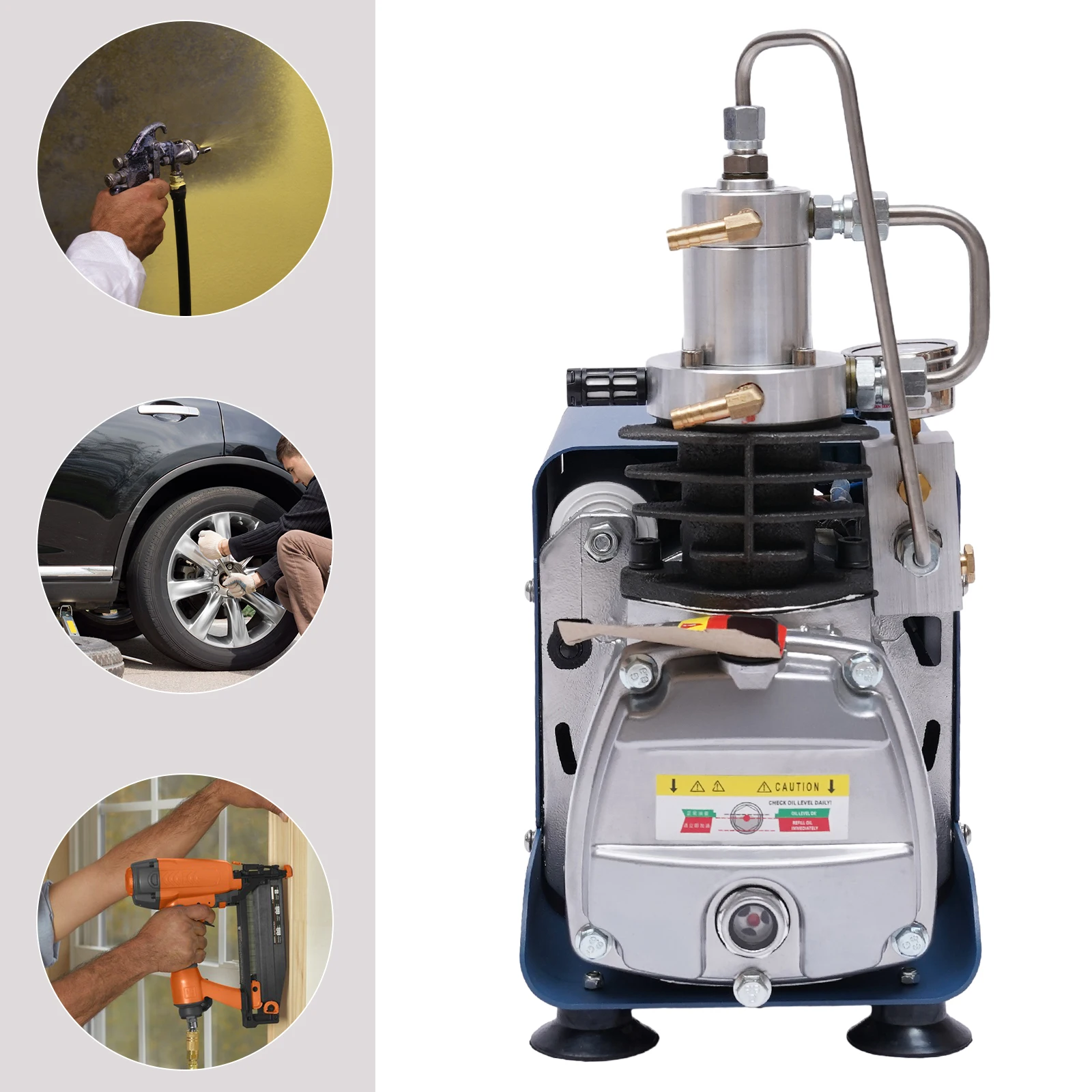 Professionelle Druckluft für deine Bedürfnisse! Dieser elektrische Kompressor schafft satte 300BAR (30MPA) Druck - perfekt für PCP-Luftgewehre, Tauchflaschen und Industrieanwendungen. Mit 1800W Leistung und Wasserkühlung für effiziente Kühlung. Integrierter Öl-Wasser-Abscheider und Sicherheitsventil bei 32MPA sorgen für sicheren Betrieb. Besonders geeignet für kleine Behälter bis 1 Liter (0,35L, 0,45L, 0,55L). Der Kupferdraht-Motor garantiert lange Lebensdauer. Einfache Bedienung mit manuellem Abschaltmodus. Achtung: Leichte Ölleckage kann normal sein. Perfekt für Jäger, Taucher und Industrie!