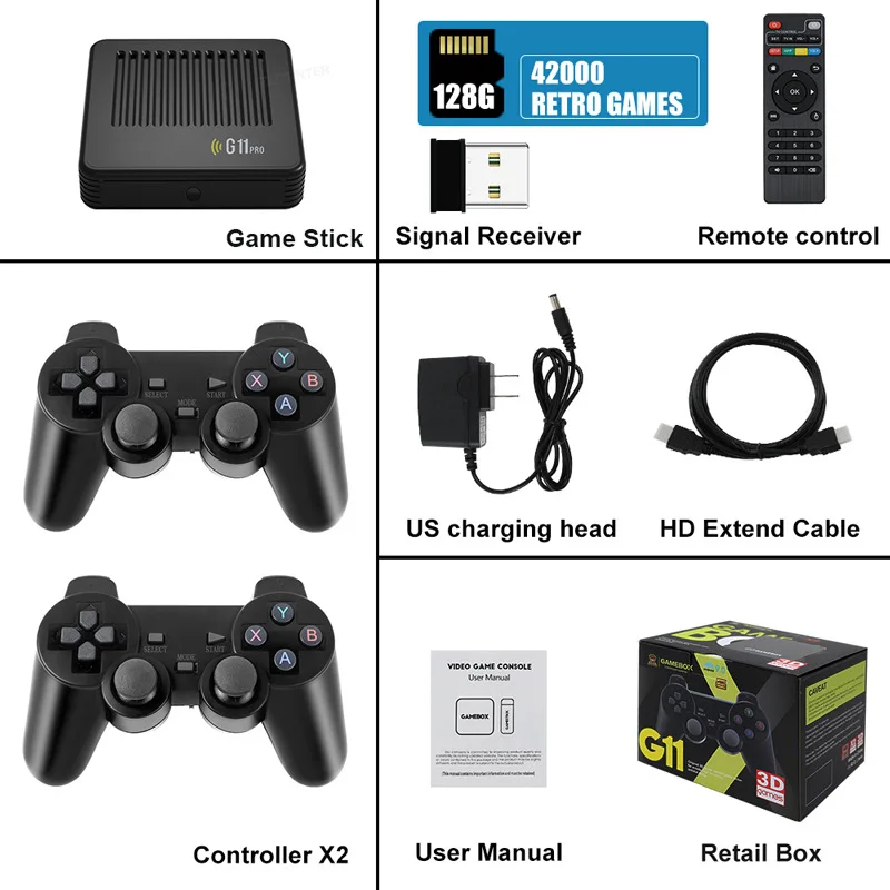 Das ultimative Retro-Erlebnis! Die Retrowave G11 Pro Konsole bringt über 40.000 klassische Spiele aus den 80ern und 90ern zurück. Mit 128GB Speicher und 4 kabellosen Controllern - perfekt für Spieleabende mit Freunden. Unterstützt 4K UHD für gestochen scharfe Grafiken. Einfache Installation: HDMI-Kabel einstecken und losspielen! Im Lieferumfang: Konsole, 4 Controller, USB-Empfänger, Ladegerät, Fernbedienung, HDMI-Kabel und Anleitung. Hol dir die Nostalgie zurück - jetzt mit moderner Technik!