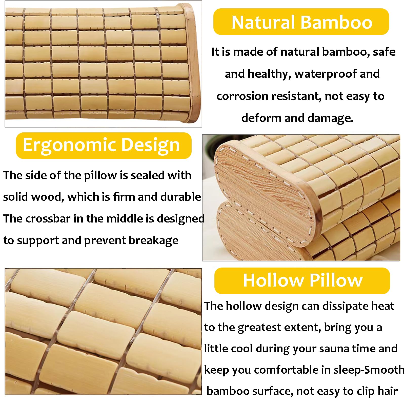Wellness pur für deine Sauna! Diese Bambus-Kopfstütze macht jedes Sauna-Erlebnis zum absoluten Entspannungstrip. 🧖♀️\n\nAus natürlichem Bambus und Holz gefertigt - hitzebeständig, wasserabweisend und mit angenehmem Naturduft. Die weiche, konturierte Oberfläche passt sich perfekt an Kopf und Nacken an.\n\nMaße: 36,1x19,1x8,9cm - ideal für die meisten Saunabänke. Leicht und tragbar, passt sich jedem Sauna-Design an.\n\nVorteile die überzeugen:\n• Anpassungsfähige Form - maximaler Komfort\n• Naturmaterialien - keine Chemie\n• Leicht und mobil - überall einsetzbar\n• Einfache Reinigung - pflegeleicht\n• Stilvolles Design - passt in jede Sauna\n\nPerfekt für:\n• Private Heimsaunen\n• Fitnessstudio-Saunen\n• Spa und Wellness-Center\n• Dampfbäder\n\nTipp: Unter den Nacken legen, nicht direkt unter den Kopf! So entspannst du optimal. Das perfekte Geschenk für Sauna-Liebhaber!