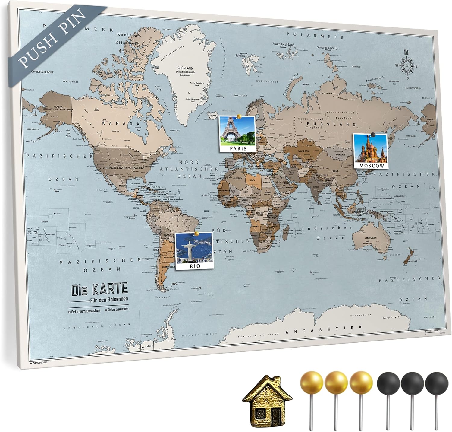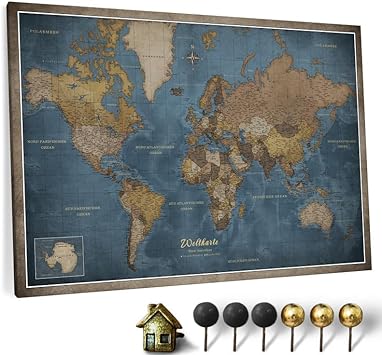 Träumst du auch von weiten Reisen? Mit dieser coolen Weltkarte als Leinwand mit Kork-Pinnwand kannst du deine Abenteuer festhalten und planen! Die Karte hat deutsche Beschriftung und zeigt alle Kontinente, Länder und sogar einzelne Städte. Mit den beiliegenden 100 Nadeln in 2 Farben und einer goldenen Stecknadel in Hausform markierst du einfach deine bereisten Länder oder planst die nächste große Tour. Das Leinwandbild ist 70x50 cm groß und passt damit super an jede Wand - ob im Wohnzimmer, Büro oder sogar im Kinderzimmer. Die Kombination aus Baumwoll-Leinwand und Korkrückwand ist nicht nur stylisch, sondern auch super praktisch. Du kannst Fotos, Notizen oder Erinnerungen anheften. Die Weltkarte ist 100% biologisch und handgefertigt - also ein richtiges Qualitätsprodukt. Perfekt für alle Reisebegeisterten, die ihre Erlebnisse visualisieren wollen oder einfach eine schöne Deko für die eigenen vier Wände suchen. Hol dir die Welt an die Wand!