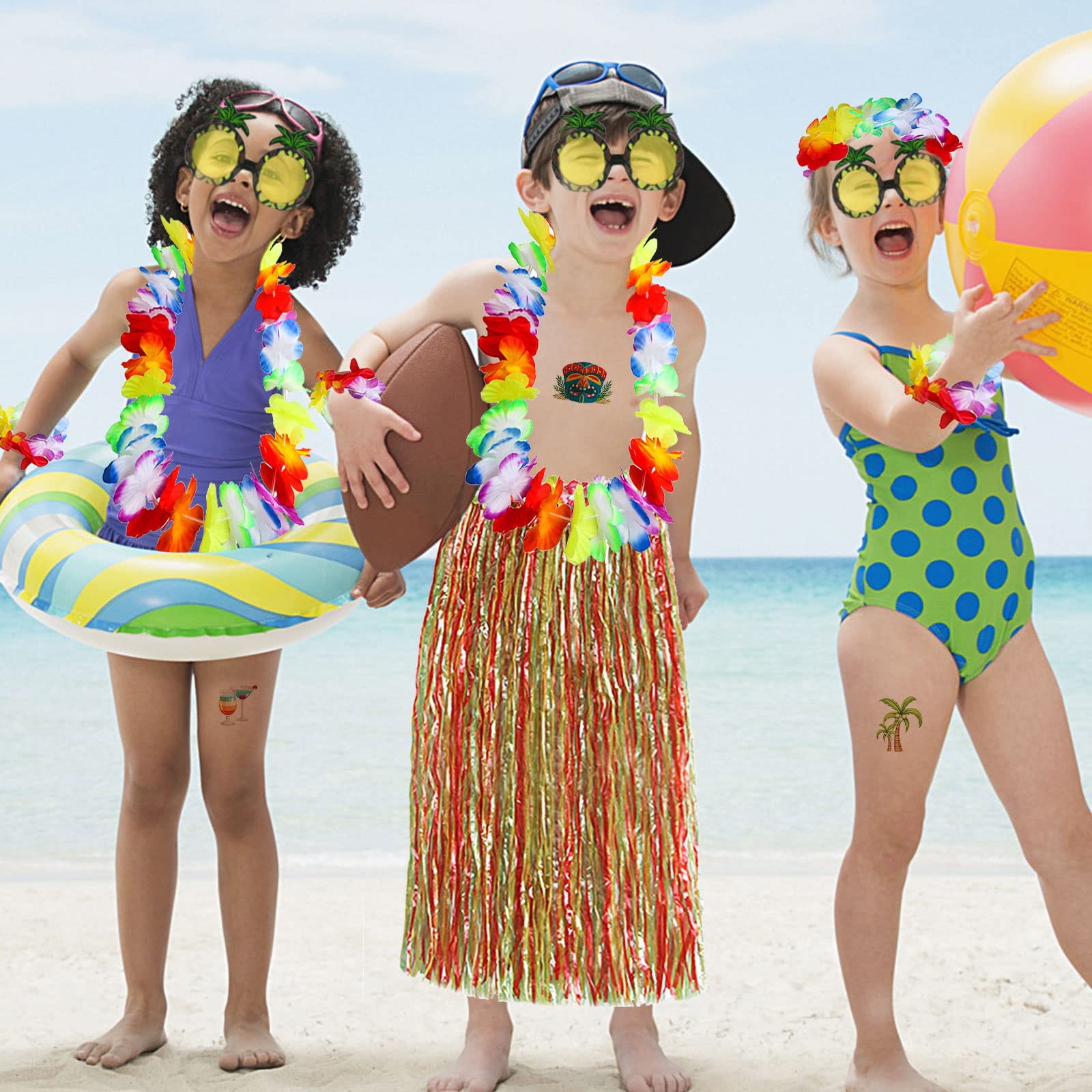 Aloha! Mach deine nächste Party zum echten Hawaii-Erlebnis mit diesem komplett Set! Das 9-teilige Paket enthält alles, was du für den perfekten Insel-Look brauchst: einen gelben Grasrock (50-92cm Taillenumfang, 50cm Länge), bunten Blumen-BH mit verstellbaren Trägern, zwei elastische Blumenarmbänder, Blumenkette (100cm Umfang), hübsche Haarblume (10x7cm), coole Ananas-Sonnenbrille und sogar 10 verschiedene Klebetattoos!