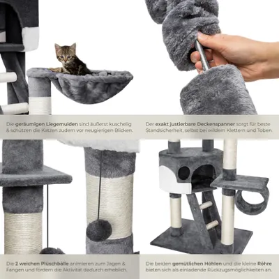Deine Katze wird verrückt nach diesem Kratzbaum sein! Der Woody Deckenspanner von Kratzbaumland bietet mit 230-240cm Höhe und 12cm dicken Sisalstämmen das ultimative Kratzvergnügen. Made in Germany mit hochwertigem 10mm Sisalseil das optimal zum Krallenschärfen geeignet ist. Die stabile 48cm Bodenplatte mit Gummifüßen und der verstellbare Deckenspanner garantieren sicheren Stand. Besonders praktisch: Jedes Teil ist einzeln nachbestellbar - so musst du nie den ganzen Kratzbaum ersetzen. Öko-Tex zertifiziert und tierfreundlich. Ein Qualitätsprodukt das Katzenherzen höher schlagen lässt!