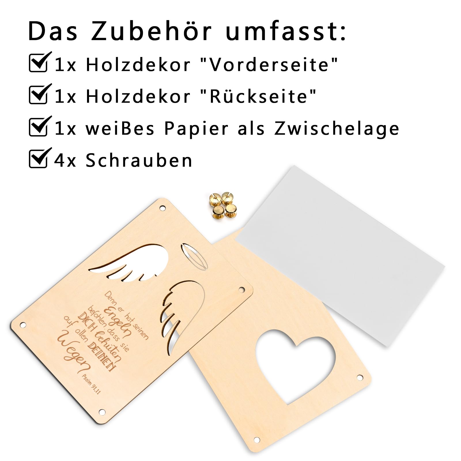 Du suchst ein besonderes Geschenk zur Taufe oder Konfirmation? Diese Holz-Geschenkkarte macht Geldgeschenke zu etwas ganz Besonderem! Einfach den Geldschein zwischen die beiden Holzplatten legen - durch die ausgeschnittenen Flügel und den Heiligenschein schimmert das Geld wunderschön durch. ✨ 2 Holzplatten + Schrauben - einfach zusammenzubauen ✨ Platz für persönliche Wünsche - inklusive Papier zum Beschriften ✨ Hochwertige Holzqualität - langlebig und schön ✨ Modernes Design - nicht langweilig wie eine normale Karte ✨ Auch für Kommunion und Jugendweihe geeignet So machst du aus einem simplen Geldgeschenk eine bleibende Erinnerung. Das Geschenk kommt garantiert gut an und ist viel persönlicher als ein einfacher Umschlag!