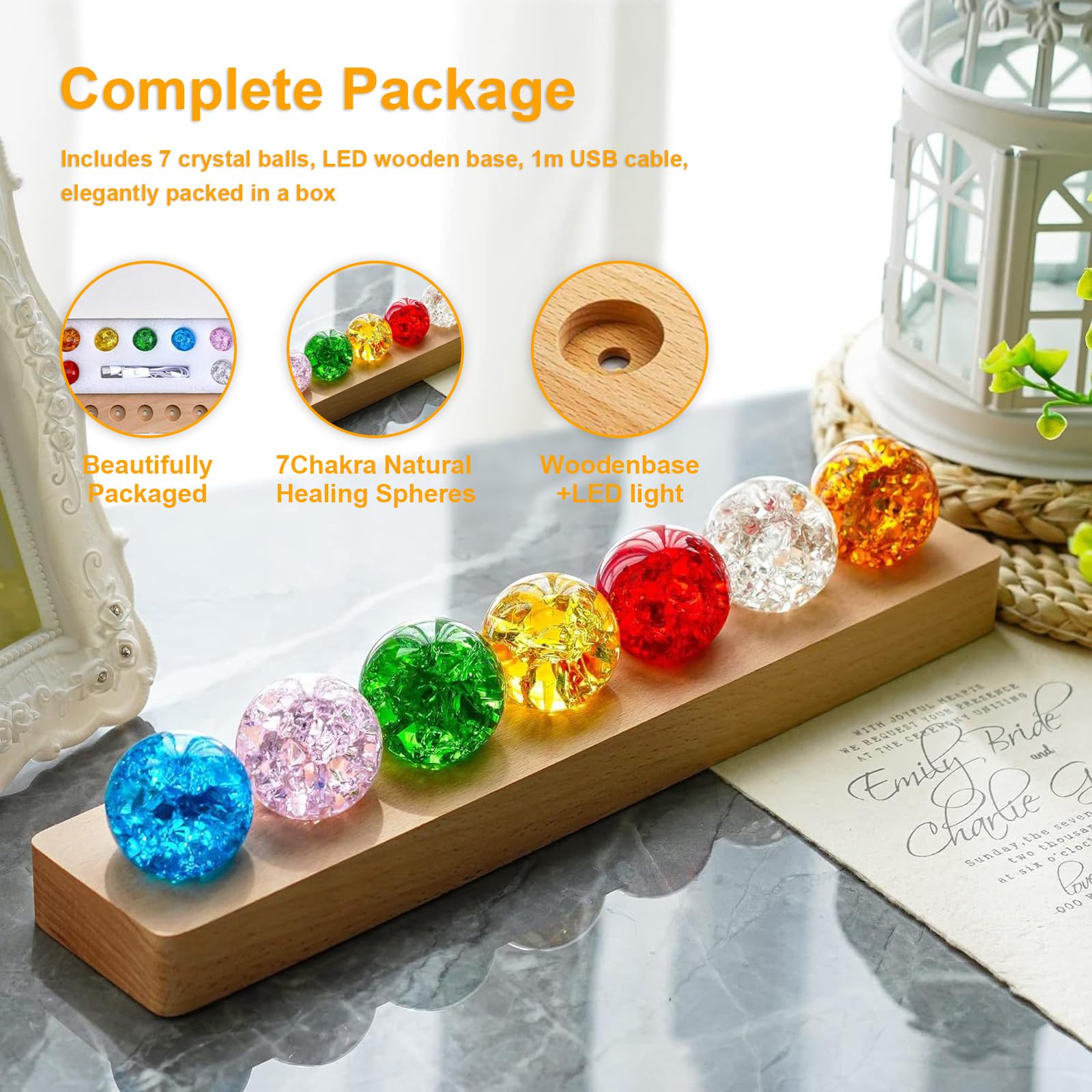 Verwandle dein Zuhause in eine magische Licht-Oase! Dieses wunderschöne Set enthält 7 einzigartige Kristallkugeln in klarem, blauem, rosa, rotem, lila, grünem und gelbem Eis-Riss-Design. Jede Kugel hat 40mm Durchmesser und wird auf dem eleganten Holzständer (31,1x6,1x2,5cm) präsentiert. Die LED-Beleuchtung erzeugt faszinierende Lichtreflexe an Wänden und Decken - perfekt zum Entspannen und Träumen. Tagsüber funkeln die Kugeln im natürlichen Licht, abends verwandeln sie sich in ein bezauberndes Lichtermeer. Einfach per USB-Kabel anschließen und sofort loslegen. Perfekt fürs Wohnzimmer, Schlafzimmer, Meditationsraum oder als besondere Schreibtischdekoration. Auch ein tolles Geschenk für besondere Anlässe - die elegante Aufmachung begeistert jeden. Schaffe dir eine gemütliche Atmosphäre und genieße den magischen Anblick dieser funkelnden Kristallkugeln. Einfach hinlegen, anschalten und den Zauber genießen!