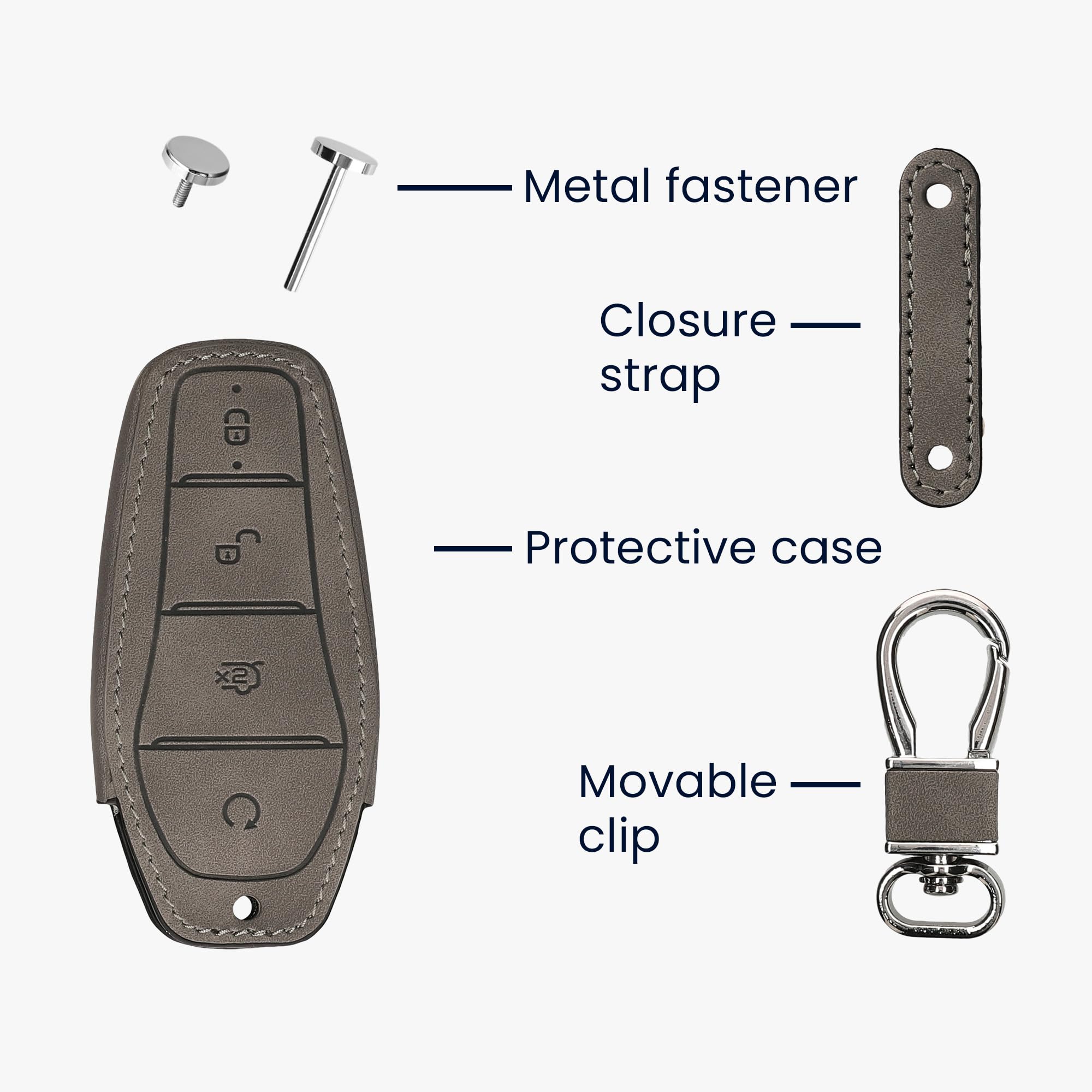 Schütze deinen BYD-Schlüssel vor Kratzern und Verschleiß! \\n\\nKompatibilität: BYD Atto 3, Sealion, Han, Tang, Dolphin, Seal \\nMaterial: Hochwertiges Kunstleder \\nFarben: Marineblau und Hellbraun \\n\\nDiese stylische Hülle passt sich perfekt an deinen Schlüssel an und schützt ihn vor den typischen Gebrauchsspuren. Die strukturierte Oberfläche liegt angenehm in der Hand und verhindert das Wegrutschen. \\n\\nToll: Alle Tasten bleiben trotz Hülle voll bedienbar - kein lästiges Aus- und Einpacken mehr! \\n\\nDas Leichtgewicht macht den Schlüssel nicht klobiger, sondern schützt ihn diskret. Die edle Lederoptik gibt dem ganzen ein hochwertiges Finish. \\n\\nEinfache Montage: Hülle aufstecken, fertig! Dein Schlüssel ist jetzt ready für den Alltag.