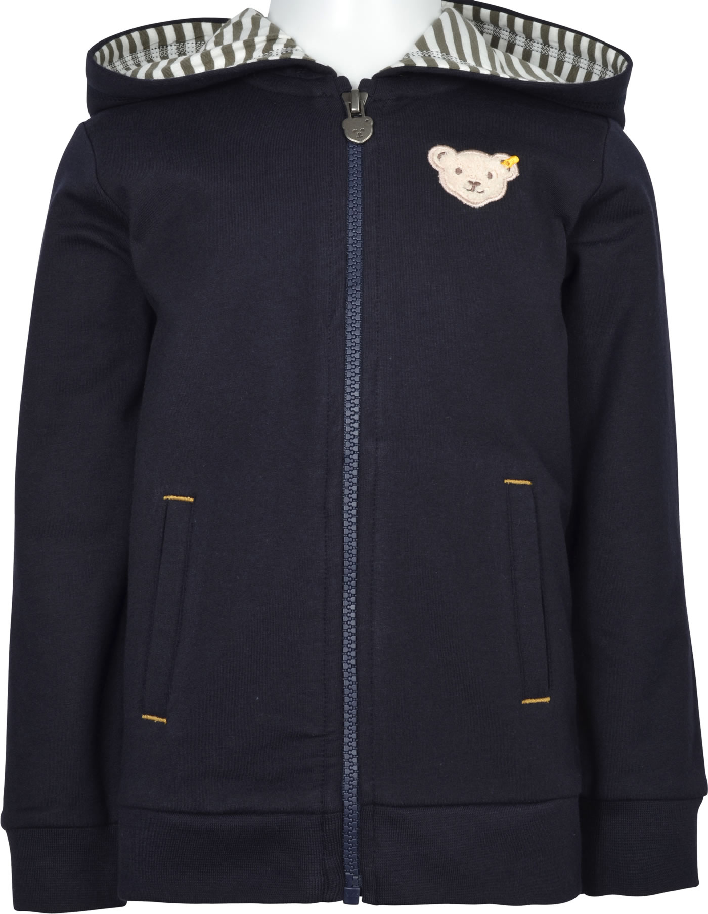Sooo kuschelig weich! Die Steiff Sweatjacke für kleine Jungs hält dein Baby richtig schön warm. Mit dem süßen Teddybär-Aufdruck wird sie schnell zum Lieblingsstück im Kleiderschrank. Der praktische Reißverschluss macht das Anziehen super einfach - kein Herumgefummel mit Knöpfen! In Gr. 68 cm und in der klassischen Navy-Farbe passt sie zu allem. Das weiche Material fühlt sich angenehm auf der Haut an und gibt aktiven Kindern trotzdem genug Bewegungsfreiheit. Wie von Steiff gewohnt: Top Qualität, unbedenkliche Materialien und saubere Verarbeitung. Perfekt für den täglichen Spaziergang oder den Kindergarten! Einfach ein tolles Basic, das nicht nur warm hält, sondern auch noch niedlich aussieht.