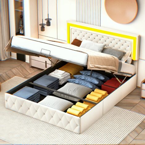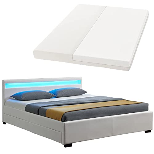 Schlafzimmer-Upgrade deluxe! Dieses OUZHOU Polsterbett in 140x200 cm ist mehr als nur ein Bett - es ist ein Erlebnis. Mit integrierter RGB-LED-Beleuchtung, die du per 24-Tasten-Fernbedienung in allen Farben des Regenbogens einstellen kannst. Ob romantisches Rot, entspannendes Blau oder knalliges Pink - deine Stimmung, deine Farbe! Das PU-gepolsterte Kopfteil ist super bequem zum Anlehnen, und der mitgelieferte Holzlattenrost trägt bis zu 220 kg. Aus hochwertigem MDF und PU gefertigt - stabil, langlebig und pflegeleicht. Das Bodendesign (nur 60,5 cm hoch) wirkt modern und lässig, perfekt für Jugendzimmer oder moderne Wohnungen. Mit 12 verstellbaren Latten passt du die Matratzenunterstützung genau an. Einfache Montage in 2 Paketen geliefert - auch für DIY-Anfänger machbar. Für Matratzen von 15-20 cm Stärke ideal. Mach dein Schlafzimmer zur Wohlfühloase mit diesem stylischen LED-Bett!
