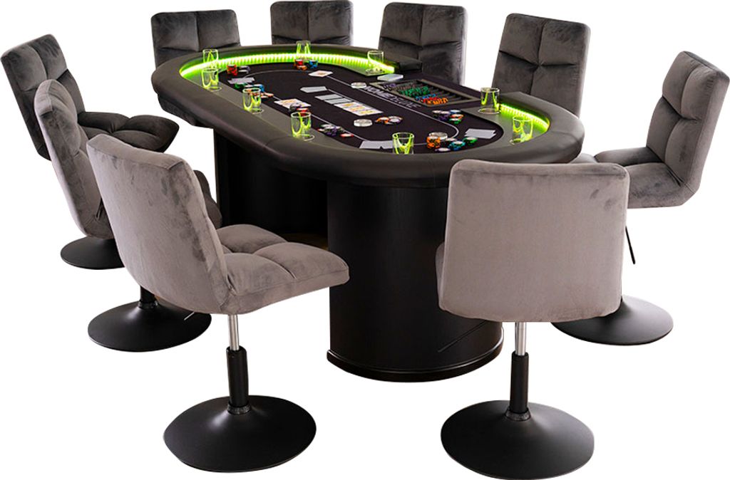 Hol dir das Casino-Feeling nach Hause! Dieser coole Pokertisch mit integrierter LED-Beleuchtung macht jede Pokerrunde zum Erlebnis. Platz für bis zu 9 Spieler plus Dealer - ideal für gemütliche Spieleabende mit Freunden. Das schwarze Filztuch ist perfekt für Texas Hold'em, Omaha und andere Kartenspiele. 9 Edelstahl-Getränkehalter und ein Chiptray sind bereits integriert. Die gepolsterten Armauflagen aus Kunstleder sorgen für Komfort auch bei langen Spielsessions. Dazu zwei höhenverstellbare Drehstühle im modernen Design. Der Tisch ist stabil aus 18mm Spanplatte gefertigt. Maße: 215x106x78 cm. Einfach aufbauen, LED anschließen und lospoken! Perfekt für Geburtstage, Jungsabende oder regelmäßige Pokerrunden. Damit wirst du zum King deines eigenen Casinos!