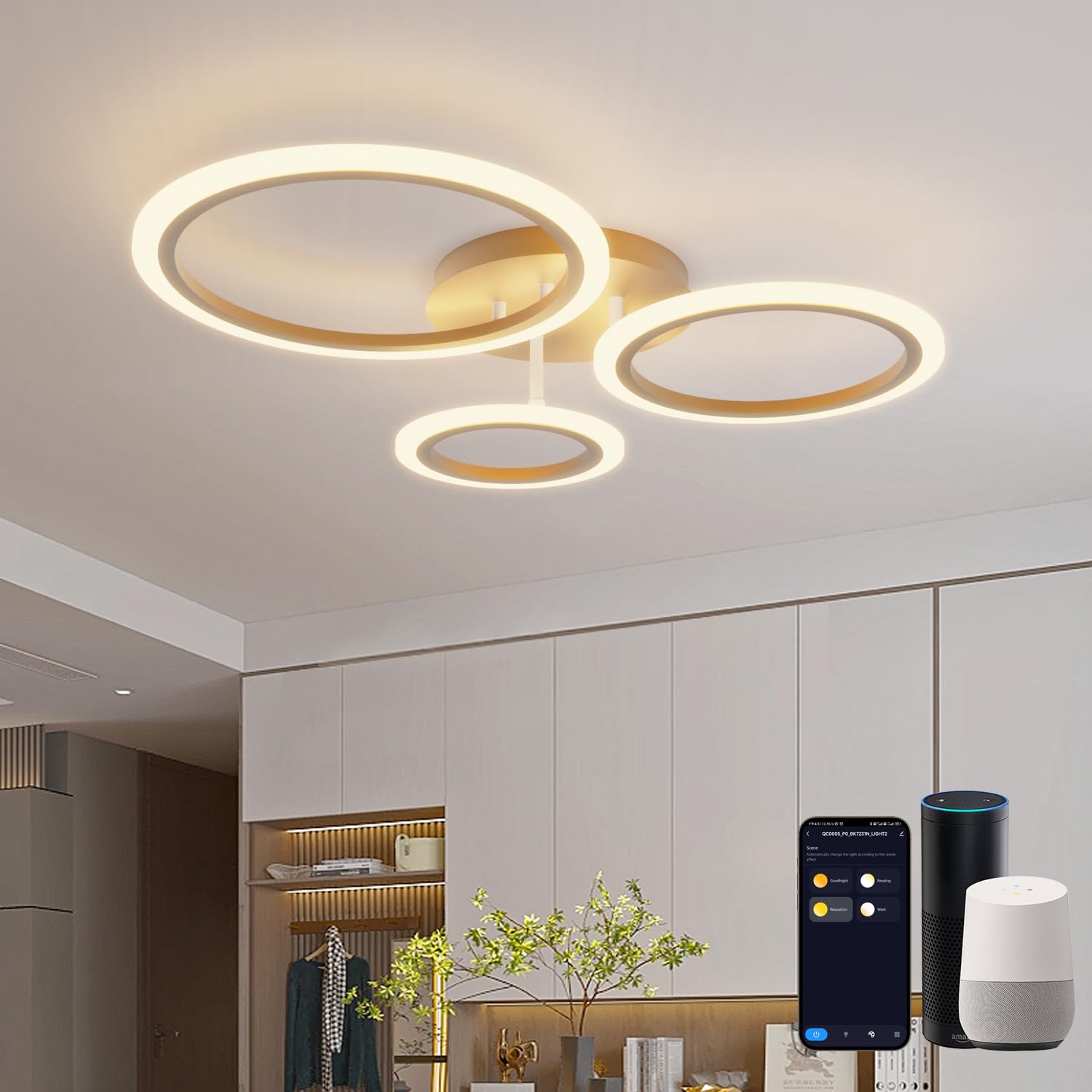 Mach dein Zuhause smart mit dieser modernen Deckenleuchte! Per WLAN mit der Smart Life/Tuya App verbinden und schon hast du die volle Kontrolle über deine Beleuchtung - egal wo du bist. Das elegante 3-Ring-Design in Schwarz passt perfekt in Schlafzimmer, Küche oder Esszimmer. Stufenlos dimmbar von 1-100% und mit verstellbarer Farbtemperatur von gemütlichem Warmweiß (3000K) bis zu konzentrationsförderndem Kaltweiß (6500K). Sprachsteuerung mit Amazon Alexa und Google Assistant macht das Bedienen zum Kinderspiel - einfach 'Alexa, Licht auf 50% dimmen' sagen! Timer und Zeitpläne helfen dir beim Energiesparen und sorgen für mehr Sicherheit durch Anwesenheitssimulation. Kein Hub benötigt - einfach mit dem 2,4 GHz WLAN verbinden und loslegen. Einfache Installation und modernes Design, das in jedes Interior passt. Erlebe die Zukunft der Beleuchtung!