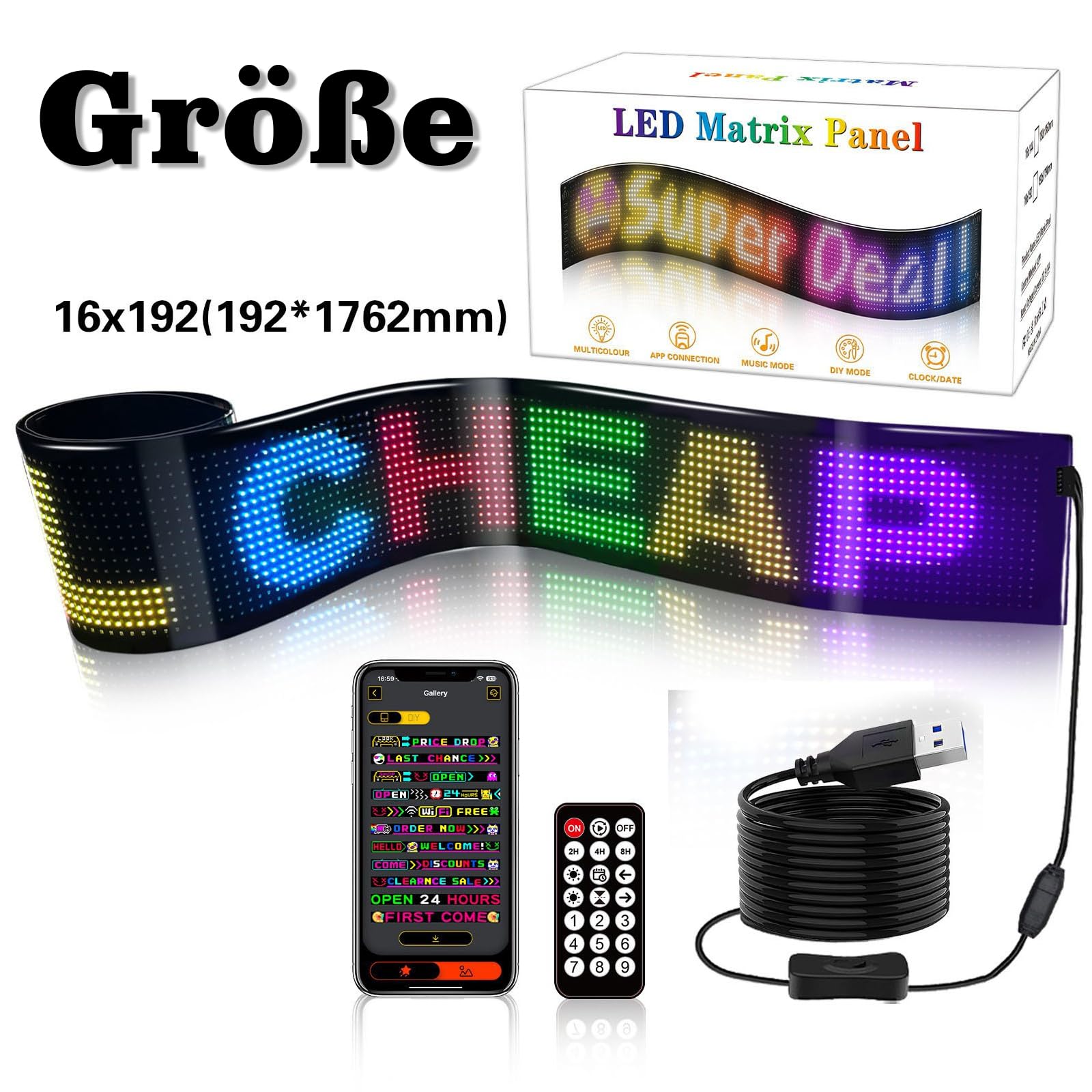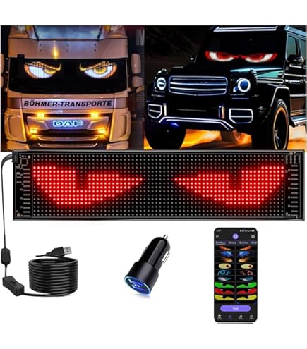 Mach dein Auto zum echten Hingucker! Mit dem ZIMAOER Devil Eyes LED Display zauberst du über 60 coole Teufelsaugen-Effekte und individuelle Laufschriften auf dein Fahrzeug. 🚗\n\nEgal ob Warnhinweise, Emojis oder eigene Texte - mit der App gestaltest du ganz easy deine persönliche Lichtshow. Das wasserdichte Panel (IP65) ist perfekt für Auto, LKW oder Schaufenster.\n\nBesonders praktisch: Du steuerst das Display per App oder Fernbedienung. Sogar zwei Displays lassen sich synchronisieren! Mit dem 5m USB-Kabel und Klebeband ist die Montage ein Kinderspiel.\n\nÜber 300 Vorlagen stehen zur Auswahl, und durch Updates kommen immer neue Designs dazu. Perfekt für Events, Werbung oder einfach um Aufmerksamkeit zu erregen!
