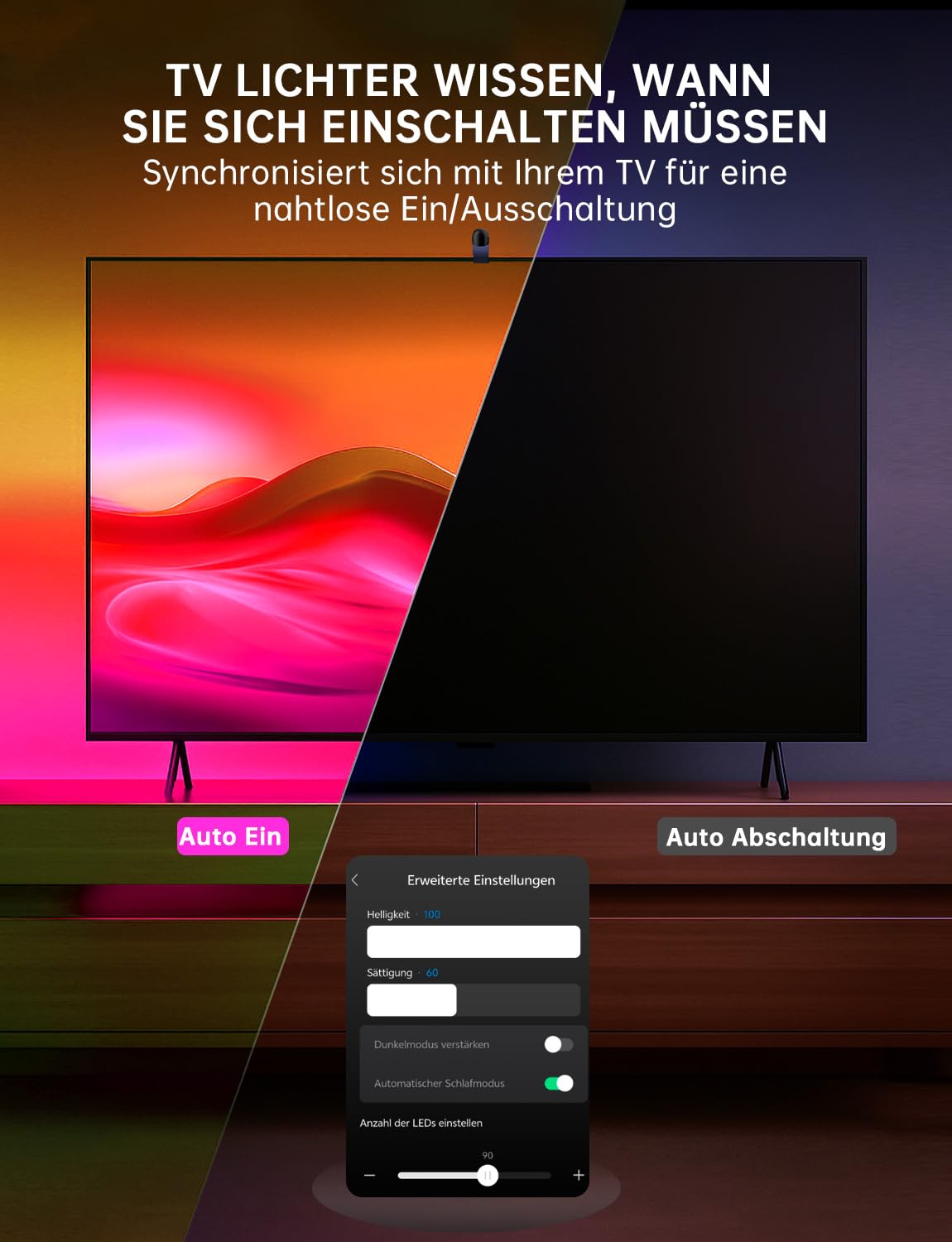 Wow, mach dein Wohnzimmer zum echten Kino-Erlebnis! Diese FFJ TV Hintergrundbeleuchtung mit 4,5 Meter LED Streifen verwandelt deinen Fernseher in eine immersive Lichtshow. Perfekt für 55-65 Zoll TVs - mit 60 LEDs pro Meter für gleichmäßiges, brillantes Licht. Der Dual-Core Sensor erkennt die Bildschirmfarben in nur 0,05 Sekunden und passt die Beleuchtung sofort an. Ob Actionfilme, Sportevents oder Games - das Licht synchronisiert sich live mit dem Geschehen auf dem Bildschirm! 24 dynamische Filmmodi und 6 musikreaktive Optionen sorgen für immer neue Stimmungen. Die Smart-App gibt dir volle Kontrolle über Helligkeit, Sättigung und Farben - alles per Bluetooth. Super praktisch: Die Beleuchtung schaltet sich automatisch mit dem TV ein und nach 5 Minuten Inaktivität wieder aus. Kein lästiges An- und Ausschalten mehr! Installation ist kinderleicht - mit starkem Klebstoff und 12 Halterungen für TVs bis 1,37 Zoll Tiefe. Die Fischaugen-Kalibrierung sorgt für perfekte Randerkennung. Ob Filmabend, Gaming-Marathon oder gemütlicher Fernsehabend - mit dieser Beleuchtung wird jeder Inhalt zum Erlebnis. Deine Gäste werden staunen!