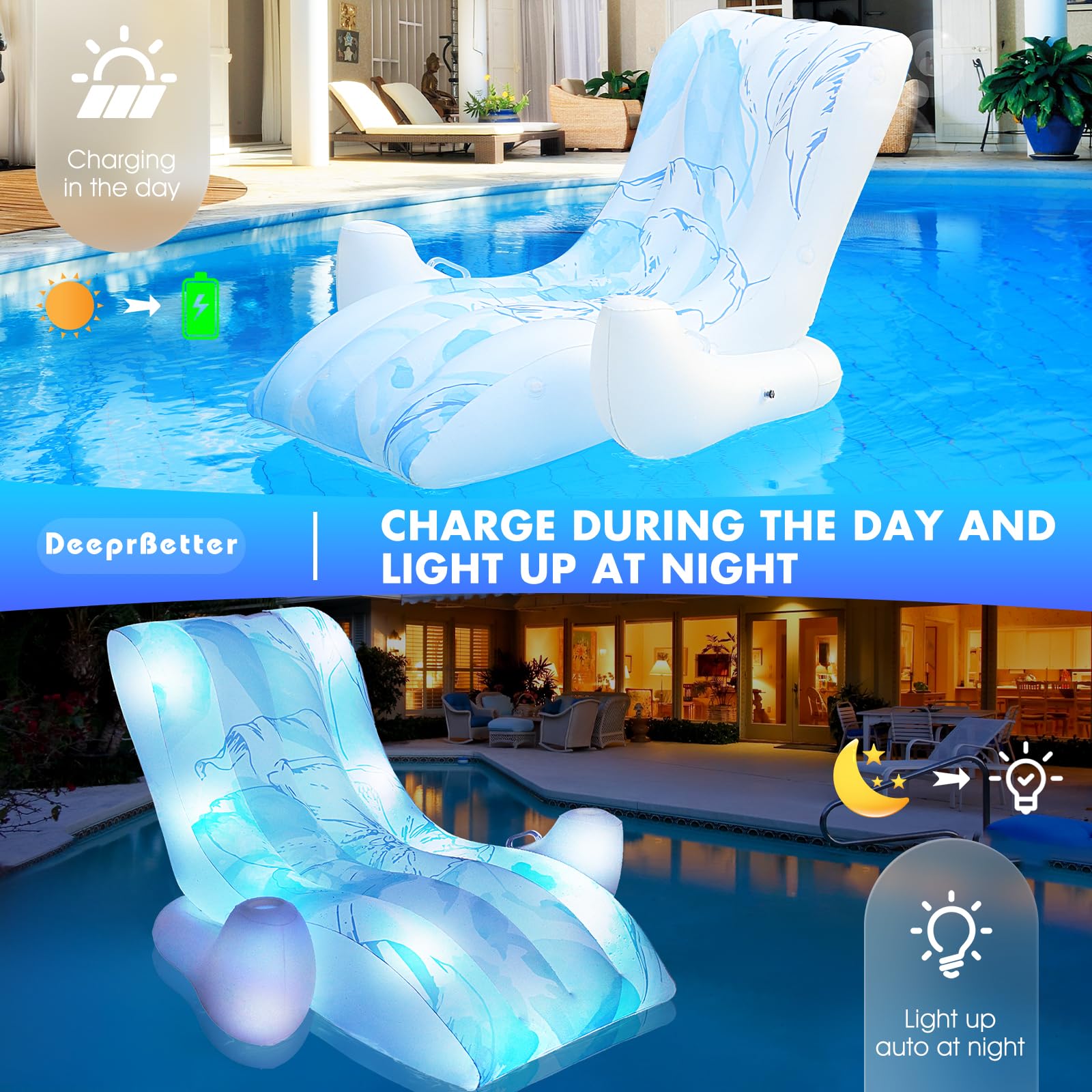 Entspannung pur mit dieser aufblasbaren Schwimmliege! Der coole LED-Farbwechsel (manuell steuerbar, ohne Solar) macht jede Poolparty zum Highlight. Mit Netzboden für angenehme Wasserzirkulation und verdickter Rückenlehne für optimalen Komfort. Aus robustem PVC, einfach aufzublasen (Pumpe nicht enthalten) und platzsparend zu transportieren. Maße: ca. 120 x 120 cm. Perfekt für Erwachsene am Strand, im Schwimmbad oder im Garten. Der Sessel hat einen integrierten Getränkehalter - so kannst du dein Lieblingsgetränk immer griffbereit haben. Die starke Konstruktion hält auch längerer Nutzung stand. Ideal für Urlaub, Camping oder sommerliche Abende im Pool. Einfach aufblasen, ins Wasser legen und relaxen! Mach deinen Sommer unvergesslich mit diesem stylischen Wasser-Sessel.