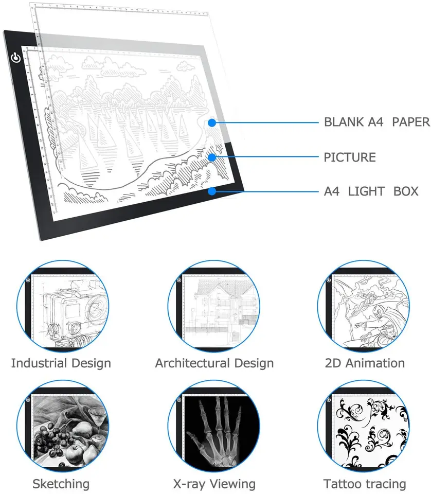 Die perfekte Hilfe für Künstler und Zeichner! Diese A4 LED Lichtbox macht Durchpausen zum Kinderspiel. Mit flimmerfreier grüner LED-Beleuchtung - absolut augenschonend und ohne lästiges Flackern. Nur 5V Stromverbrauch über USB-Anschluss, also super sicher und energieeffizient. Das verstärkte Sicherheitsglas ist kratzfest, alterungsbeständig und bietet perfekte Lichtdurchlässigkeit. Ultra-dünn und leicht - ideal für unterwegs oder im Studio. Einfach anzuschließen und sofort einsatzbereit. Perfekt für Künstler, Animationszeichner, Tätowierer oder Hobby-Bastler. Ob du Motive durchpausen, Skizzen übertragen oder einfach nur besser zeichnen willst - mit dieser Lichtbox klappt's garantiert. Dein neuer bester Freund für kreative Projekte!