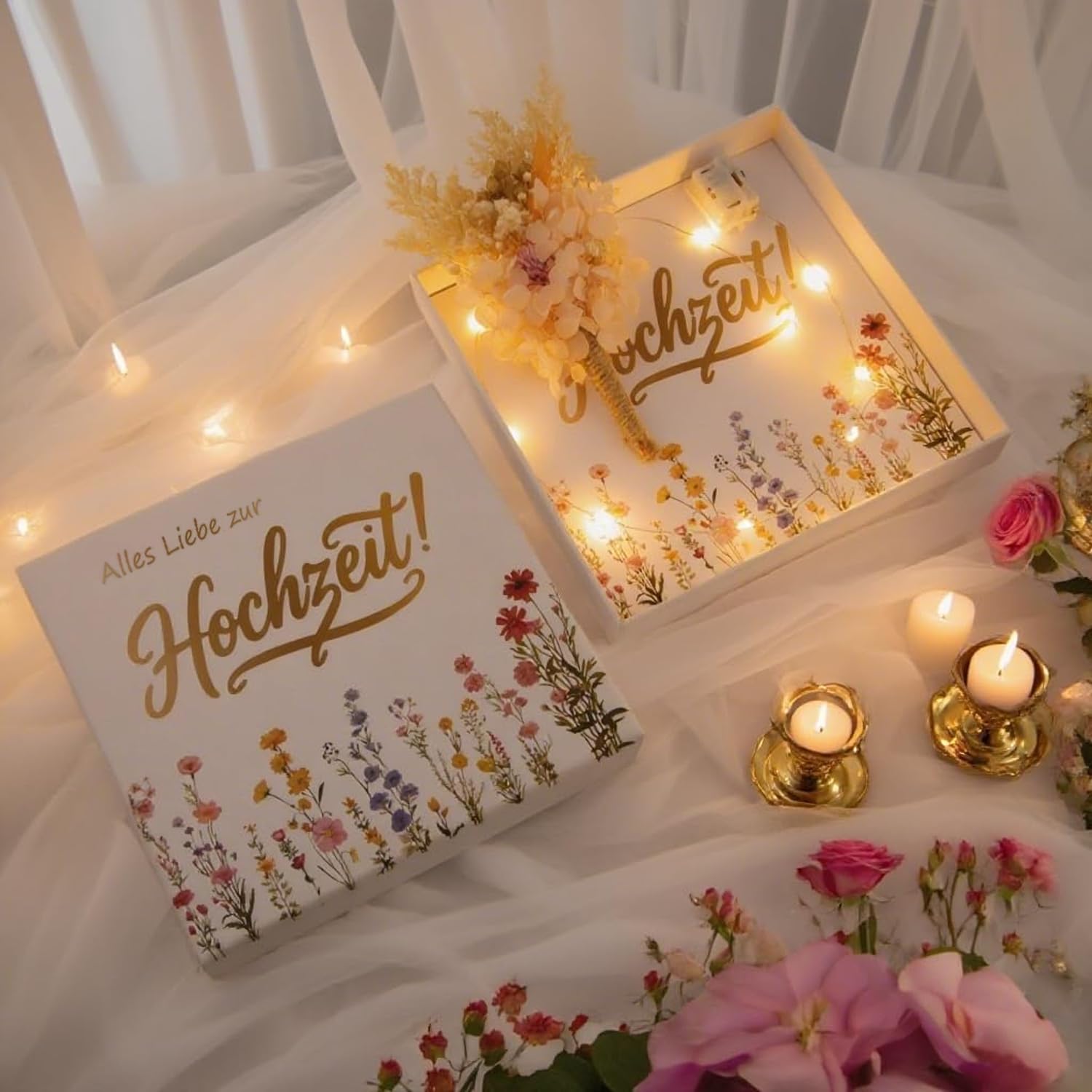 Suchst du ein besonderes Geschenk fürs Brautpaar? Diese süße Geschenkbox ist perfekt für Geldgeschenke oder andere Überraschungen! Aus natürlichem Kiefernholz sieht sie nicht nur super aus, sondern ist auch wiederverwendbar - das Brautpaar kann später Erinnerungen darin aufbewahren. Mit dabei: eine 1m lange LED-Lichterkette mit 20 LEDs im warmen Weiß - macht sofort romantische Stimmung! Dazu ein dekoratives Reagenzglas für Geldscheine oder Liebesbotschaften und ein zarter Trockenblumenstrauß. Alles kommt fertig verpackt mit Hochzeitskarte - einfach deinen Gruß reinschreiben und verschenken! Perfekt für Trauzeugen, Freunde oder Familie. Viel schöner als ein einfacher Umschlag und eine bleibende Erinnerung an den großen Tag! Damit machst du definitiv mehr her als mit einem langweiligen Kuvert!