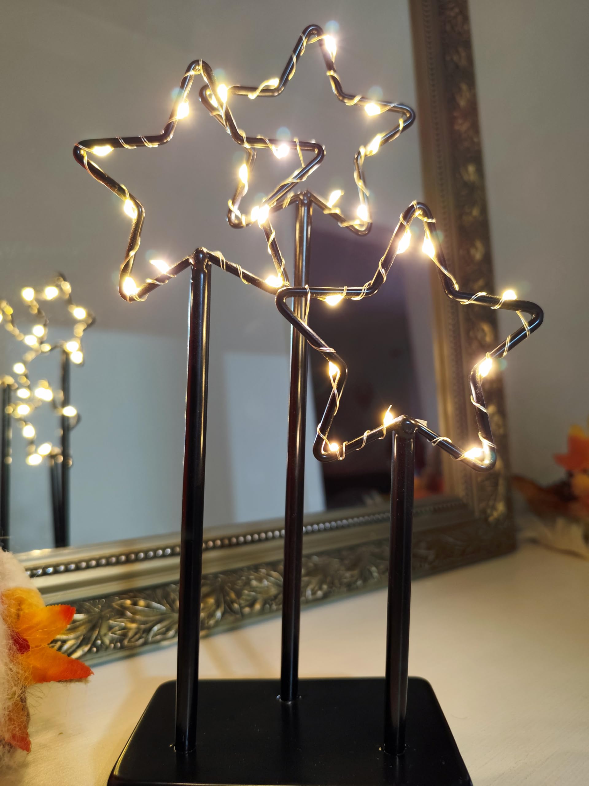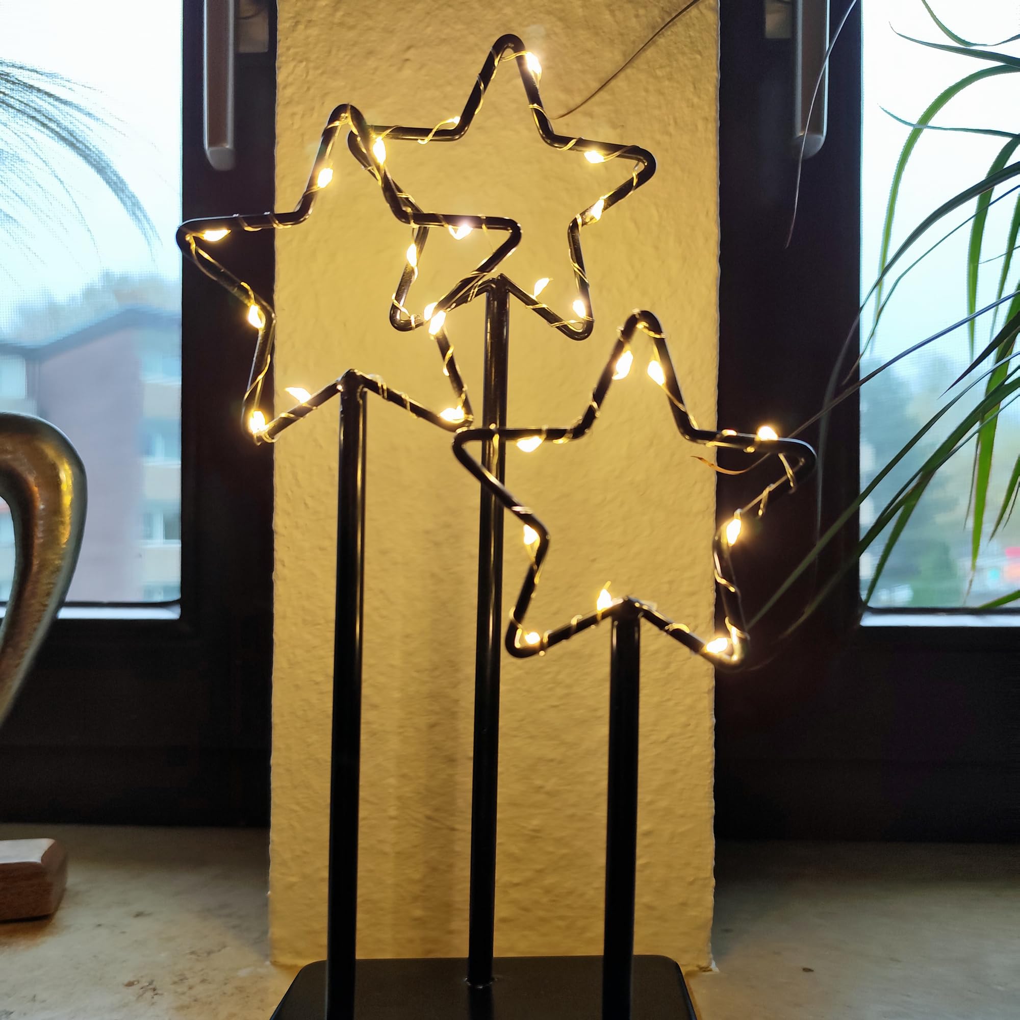 Magische Weihnachtsstimmung garantiert! Dieser metallene Stern-Aufsteller mit 30 warm-weißen LEDs verwandelt jeden Raum in ein winterliches Paradies. Maße: 24x5x40 cm - auffällig aber nicht zu groß. Batteriebetrieben (2x AA, nicht im Lieferumfang) mit praktischem An/Aus-Schalter. Die LEDs sind super energiesparend und halten ewig. Perfekt für Wohnzimmer, Fensterbank, Esstisch oder Schlafzimmer. Aber nicht nur zu Weihnachten - auch für Hochzeiten, Geburtstage oder romantische Abendessen geeignet. Robustes Metall, hochwertig verarbeitet. Einfach aufstellen, einschalten und den Zauber genießen. Wird garantiert zum Eyecatcher!