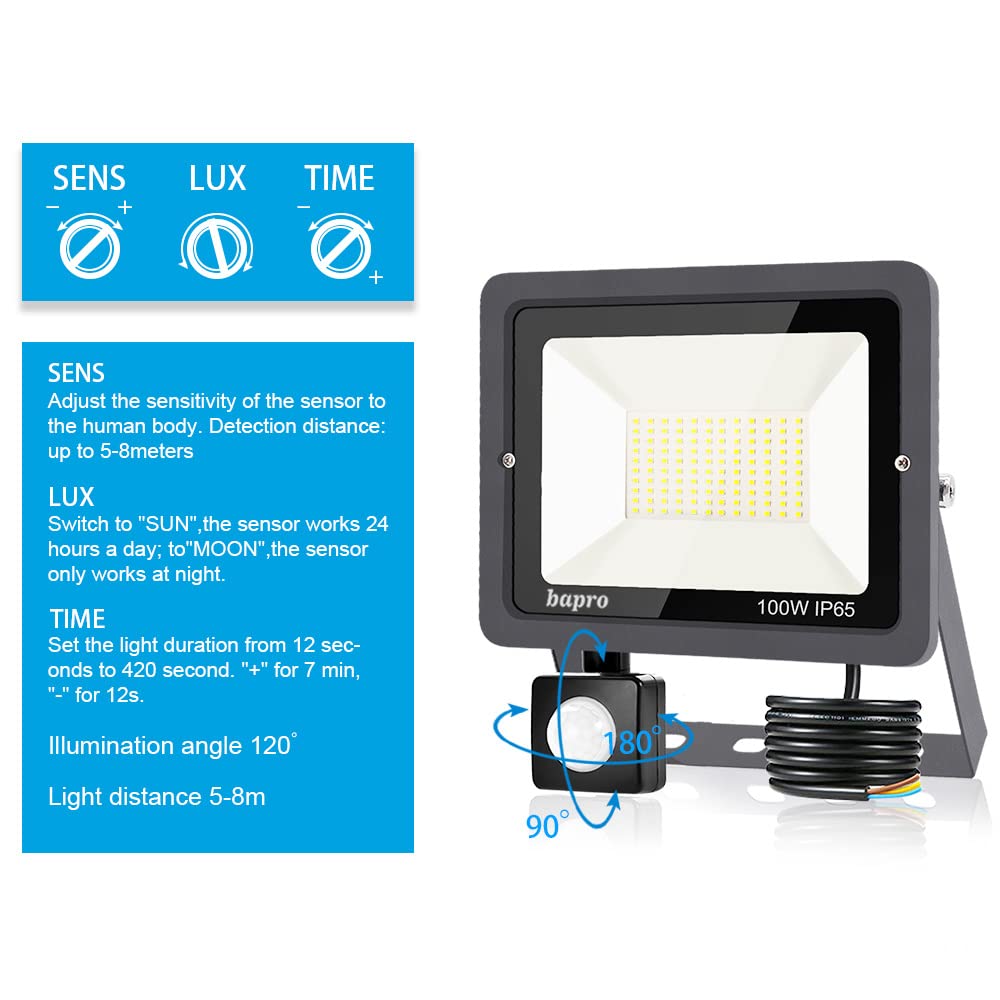 Perfekte Beleuchtung für dein Zuhause! Dieser 100W LED Strahler mit Bewegungsmelder sorgt für Sicherheit und Komfort. In warmweiß 3000K für angenehmes Licht. IP65 schützt zuverlässig vor Regen und Staub. Bewegungsmelder mit einstellbarer Reichweite (2-6m) und Beleuchtungszeit (12s-180s). Zwei Modi: Sonne (Tag/Nacht) oder Mond (nur Nachts). Flexibler Ständer für optimale Lichtausrichtung. 120° Beleuchtungswinkel für große Flächen. Energieeffiziente LED-Technologie mit langer Lebensdauer. Ideal für Garten, Garage, Einfahrt oder Gewerbe. Einfache Installation - sofort einsatzbereit für mehr Sicherheit rund ums Haus!