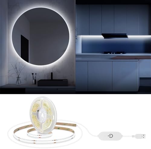 Professionelle Beleuchtung für dein Zuhause! Dieser 2 Meter lange COB LED Streifen mit 640 LEDs liefert super gleichmäßiges, helles Licht ohne störende Lichtpunkte. Mit 6000K Kaltweiß schaffst du eine konzentrierte, moderne Atmosphäre - perfekt für Arbeitszimmer, Regale oder Vitrinen. \n\nDer Streifen läuft mit sicherer 24V Niederspannung und spart dabei bis zu 50% Energie compared zu herkömmlicher Beleuchtung. Besonders praktisch: Alle 5cm ist der Streifen schneidbar - so passt er genau in deine individuellen Beleuchtungsprojekte. Mit nur 8mm Breite ist er super unauffällig. \n\nDie starke 3M Klebeschicht auf der Rückseite macht die Installation zum Kinderspiel - einfach Schutzfolie abziehen und auf sauberen Oberfläche anbringen. Kein Werkzeug nötig! Netzteil nicht im Lieferumfang enthalten. Mit 1 Jahr Garantie und deutschem Service. Hol dir professionelles Licht für deine vier Wände!