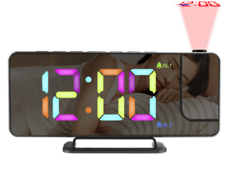 Wow, dieser Wecker projiziert die Uhrzeit in roten Ziffern an deine Wand oder Decke! Perfekt für alle, die nachts nicht die Brille suchen wollen oder einfach was Besonderes möchten. Die Projektion bleibt bei jedem Tastendruck 10 Sekunden aktiv und lässt sich um 90 Grad drehen - super praktisch! Mit 10-Minuten-Schlummerfunktion, die maximal 6 Mal wiederholt - ideal für alle Morgenmuffel. Das coole Feature: Die Sprachfunktion sagt dir auf Englisch die aktuelle Uhrzeit an. Du kannst zwischen 5 verschiedenen Alarmtönen wählen, da ist für jeden Geschmack was dabei. Das LCD-Display zeigt zusätzlich Zeit und Temperatur mit grüner Hintergrundbeleuchtung an - alles gut ablesbar. Ob im Schlafzimmer, Büro oder Gästezimmer - dieser Wecker ist ein echter Hingucker! Einfach auf den Nachttisch stellen, zur Decke ausrichten und schon siehst du nachts immer die Uhrzeit, ohne dich groß anstrengen zu müssen. Modern, funktional und sieht dazu noch super stylisch aus! Perfekt für Technik-Fans und alle, die ihr Schlafzimmer aufwerten wollen.
