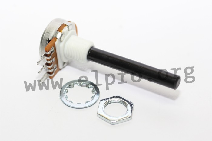 Präzisions-Potentiometer von OMEG für Elektronik-Projekte! 4,7MΩ Widerstand, 0,4W Leistung, linearer Verlauf. Mit 6mm Achse, 43mm Achslänge, 300° Drehwinkel. THT-Montage, max. 500V DC.