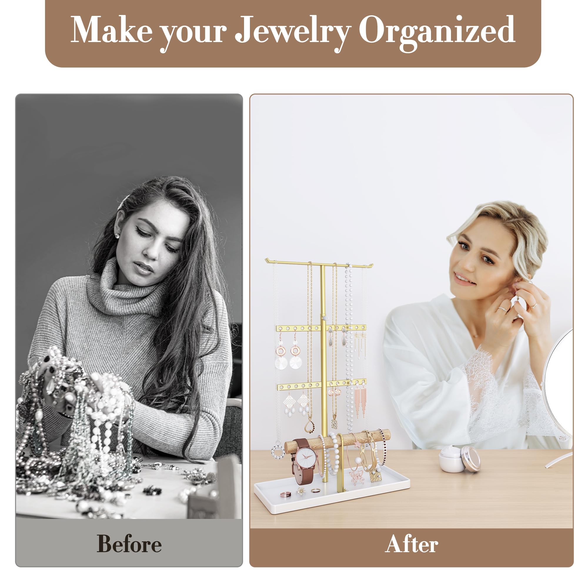 Na, liegt dein Schmuck auch immer wild durcheinander? Mit diesem edlen Schmuckständer aus Holz und Metall hast du endlich Ordnung! Der stabile Holzsockel gibt sicheren Halt, während die Metallhaken deine Halsketten und Armbänder schön übersichtlich präsentieren. Der Aufbau ist super einfach - alles dabei, was du brauchst. Das Design ist schön schlicht und passt damit in fast jede Einrichtung. Ob auf dem Schminktisch, im Badezimmer oder auf der Kommode - überall sieht er klasse aus. Die rutschfeste Unterseite verhindert lästiges Verrutschen und Kratzer auf der Oberfläche. Du kannst endlich alle deine Lieblingsteile ordentlich aufbewahren und hast sie immer griffbereit. Besonders praktisch: Der Ständer spart echt Platz! Das macht ihn auch zu einem super Geschenk für jede Frau oder jedes Mädchen - egal ob Geburtstag, Weihnachten oder einfach so. Sie wird sich bestimmt freuen! Endlich kein lästiges Entwirren von Ketten mehr - einfach rausnehmen und tragen. So macht Schmuck richtig Spaß!