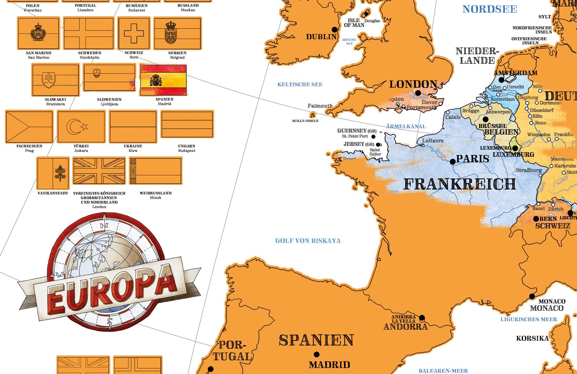 Was für eine coole Idee! Diese Rubbelkarte zeigt dir genau, wo du in Europa schon überall warst - und wo noch nicht! 🌍\n\nDie Karte ist riesig - stolze 61x91,5 cm - und zeigt Europa im politischen Stil. Jedes Land ist mit einer goldenen Schicht überzogen. Immer wenn du ein Land bereist hast, kratzt du die goldene Schicht ab und darunter erscheint das bunte Land.\n\nSuper für Reise-Fans, Globetrotter und alle, die ihre Erinnerungen sichtbar machen wollen. Die Karte ist auf schwerem 250g/m² Papier gedruckt - also richtig hochwertig.\n\nIch liebe es, nach jedem Urlaub nach Hause zu kommen und die neu besuchten Länder freizurubbeln. Das macht richtig Spaß und du siehst auf einen Blick, wie viel von Europa du schon erkundet hast.\n\nPerfekt fürs Wohnzimmer, Homeoffice oder Kinderzimmer. Sieht nicht nur super aus, sondern ist auch noch ein toller Gesprächsstarter wenn Besuch da ist.\n\nUnd weißt du was? Die Karte ist auf Deutsch beschriftet und voller Details. Sogar kleine Inseln sind drauf!\n\nOb für dich selbst oder als Geschenk für reisebegeisterte Freunde - diese Karte macht einfach Laune. Und motiviert, noch mehr von Europa zu entdecken!\n\nKleiner Tipp: Nimm eine Münze zum Rubbeln - geht damit am besten!