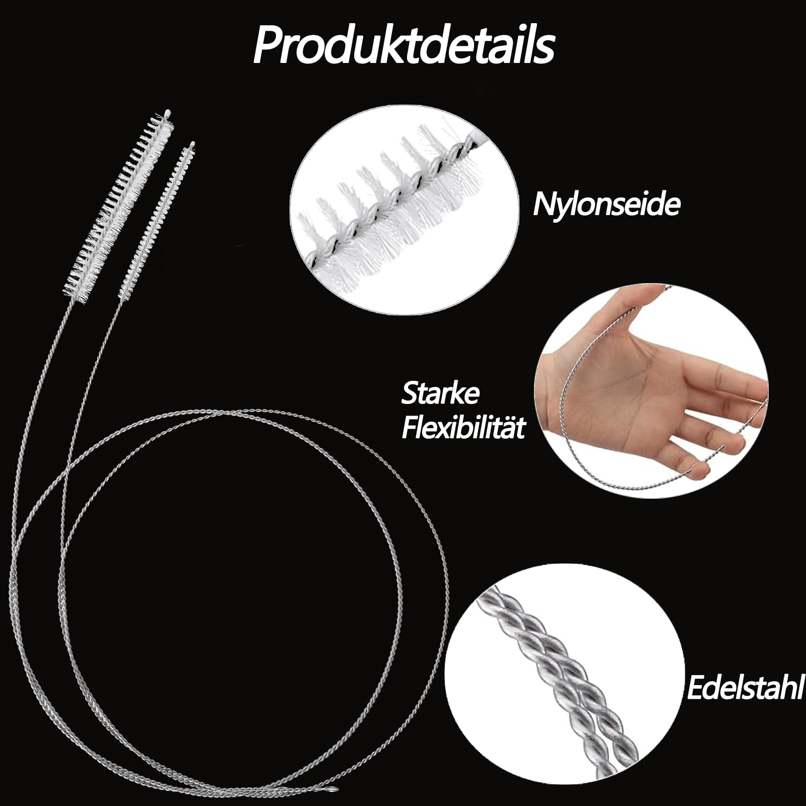 Für die Stellen, die sonst keiner putzt! Diese beiden ultra-langen Bürsten (je 100cm) kommen auch in die engsten Ecken. Aus flexiblem Edelstahldraht mit weichen Nylonborsten - schonend, aber gründlich. Eine Bürste hat 1,2cm, die andere 0,6cm Borstenlänge - perfekt für verschiedene Rohrdurchmesser. Ob Wasserkocher, Trinkhalme, Aquarium-Schläuche oder Abflüsse: Damit wird alles blitzblank! Die Borsten sind flusenfrei und kratzen nicht. Super praktisch im Haushalt, in der Küche, fürs Auto oder Bastelprojekte. Einfach um die Ecke biegen und reinigen, was sonst unerreichbar bleibt. Das Set besteht aus zwei verschiedenen Bürsten für alle möglichen Reinigungsaufgaben. Endlich Schluss mit verstopften oder verschmutzten Röhren!