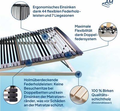 Endlich erholsam schlafen mit diesem hochwertigen Lattenrost von Sleepneo! In 160x200 cm Größe, Made in Germany und mit 7 ergonomischen Zonen für perfekte Körperunterstützung. Aus stabilem Buchenholz-Rahmen und 28 Federleisten aus Birkenholz - hält bis zu 150 kg aus. Die verschiedenen Härtezonen entlasten Schultern, Becken und Lordosenbereich optimal. Passt zu allen Matratzentypen wie Taschenfederkern oder Kaltschaum. Besonders praktisch für Doppelbetten - keine störende Besucherritze! Einfache Selbstmontage mit bebilderter Anleitung. Die elastischen Duo-Kappen aus Kautschuk sorgen für geräuscharme Lagerung. Hol dir diesen Qualitäts-Lattenrost und genieße erholsame Nächte!