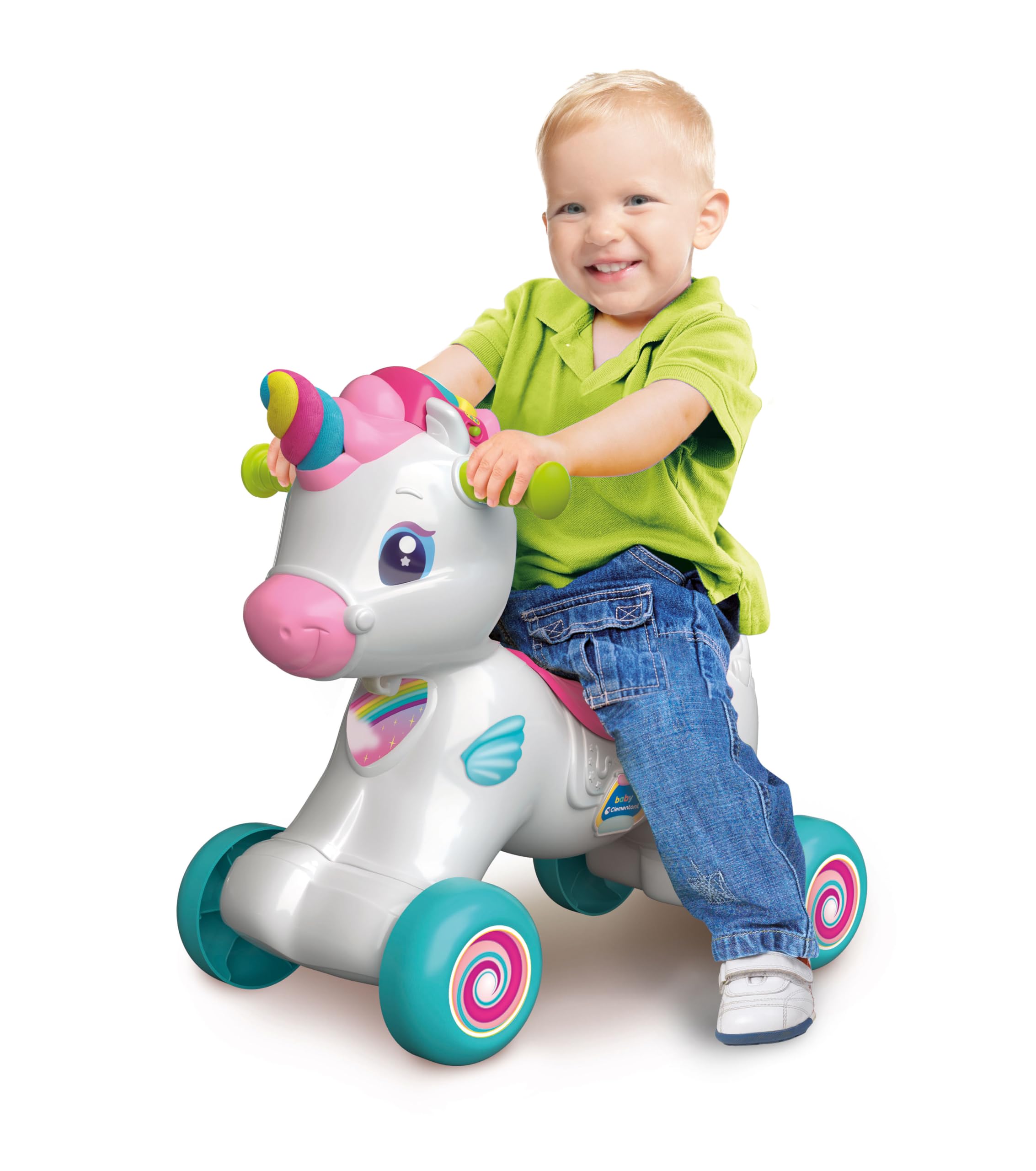 Für die kleinsten Einhorn-Fans! Dieser süße Lauflernwagen von Clementoni begleitet dein Kind bei den ersten Schritten. Mit interaktiven Knöpfen auf dem Sattel, die lustige Soundeffekte und Lieder aktivieren. Das freundliche Einhorn fördert die motorische Entwicklung und sensorische Fähigkeiten. Aus stabiler Qualität und Made in Italy - da stimmt einfach alles! Einfach an der Leine ziehen und loslaufen. Das perfekte Geschenk für Kinder ab 10 Monaten - magisch und pädagogisch wertvoll!