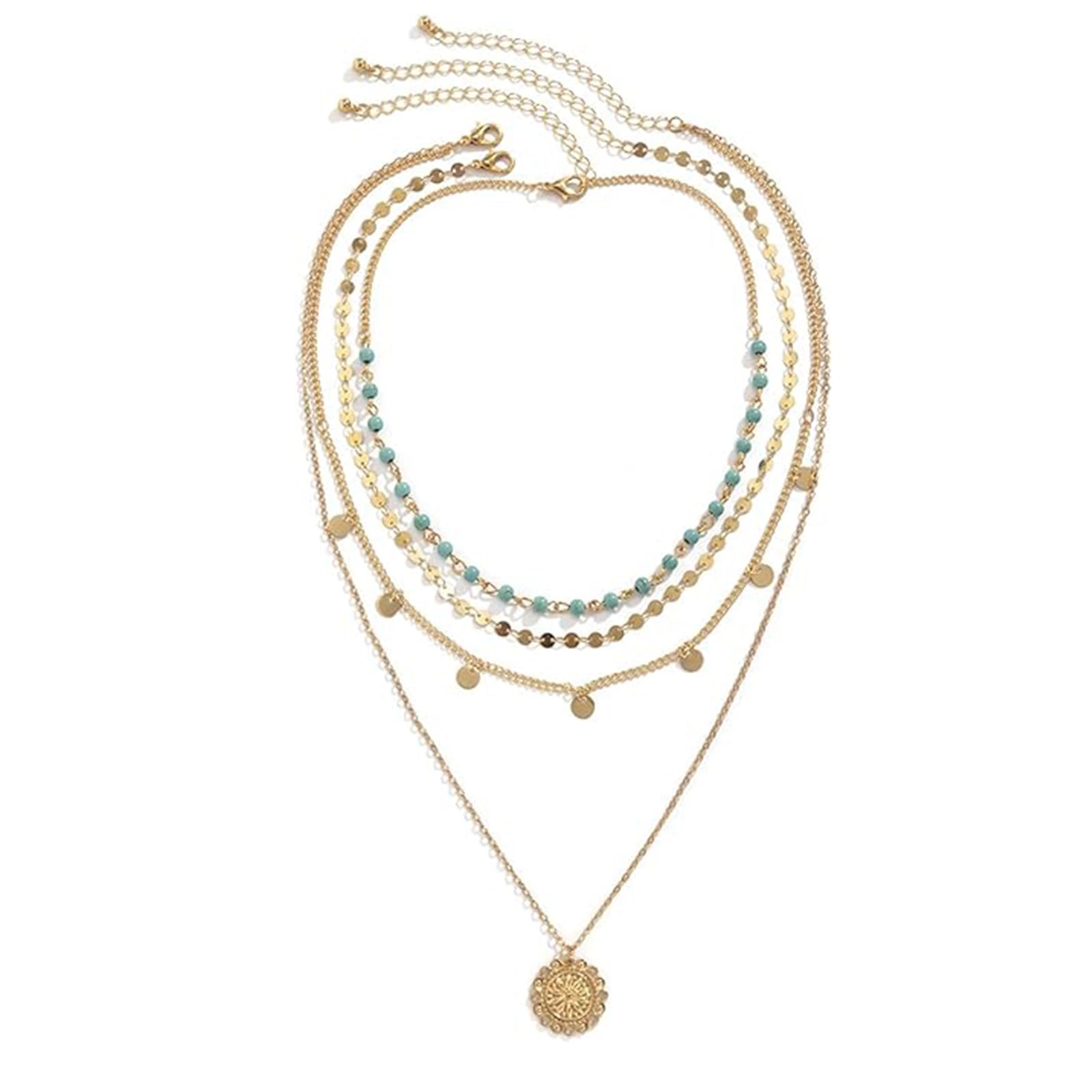 Wow, diese Boho-Halskette ist einfach der Hammer! Mit vier verschiedenen Schichten kannst du sie ganz nach Lust und Laune kombinieren - mal nur eine Schicht, mal alle zusammen. Die türkisfarbenen Steine, glitzernden Pailletten und coolen Münzen sehen einfach mega aus und geben jedem Outfit sofort eine besondere Note. Egal ob zum Sommerkleid, zur Jeans oder zum Büro-Outfit - diese Kette passt immer! Und das Material ist super hochwertig, du kannst sie den ganzen Tag tragen ohne dass sie drückt oder unangenehm wird. Perfekt als Geschenk für Geburtstage, Weihnachten oder einfach so für deine beste Freundin, Schwester oder dich selbst! Sie sieht viel teurer aus als sie ist - das ist unser kleines Geheimnis. Einfach umhängen und sich über das neue Lieblingsstück freuen!
