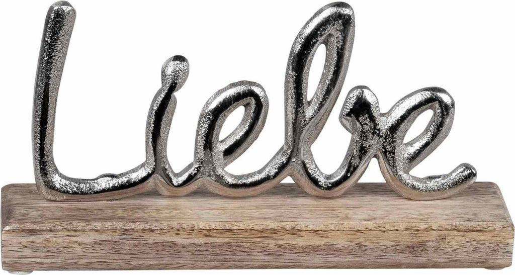 Die schönste Lebensphilosophie für dein Zuhause! Dieser wunderschöne 'Lebe Liebe Lache'-Schriftzug kombiniert modernes Aluminium in Silber mit warmem Mangoholz. Mit 24cm Höhe ist er ein echter Hingucker auf Sideboard, Regal oder als Tischdekoration. Die harmonische Verbindung von kühlem Metall und natürlichem Holz schafft sofort eine gemütliche Atmosphäre. Perfekt für alle die ihren vier Wänden mehr Positive Energie verleihen wollen. Sieht nicht nur gut aus, sondern erinnert dich auch täglich an die wichtigen Dinge im Leben. Einfach hinstellen und strahlen!