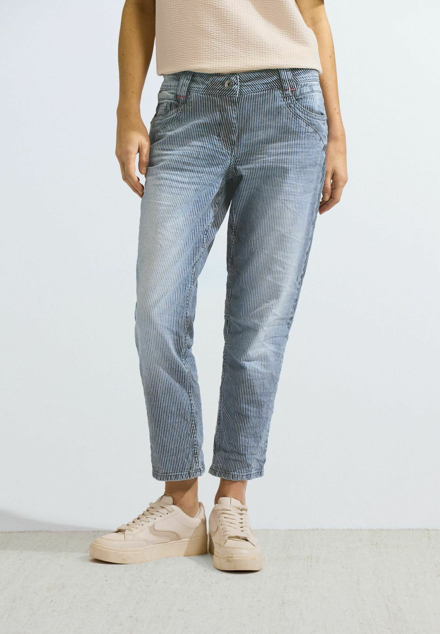 Der perfekte Jeans-Klassiker für deinen Alltag! Diese Cecil Damen Jeans im Toronto Style kombiniert modernen Slim Fit mit bequemer High Waist und geraden Straight Legs. Der Rinsed Look verleiht dem Denim eine cleanee, zeitlose Optik, die zu allem passt. Mit Baumwoll-Mix und Stretchanteil bietet sie dir maximale Bewegungsfreiheit - ob im Office, beim Shoppen oder in der Freizeit. Der klassische 5-Pocket-Style mit vorderen und hinteren Taschen sorgt für praktischen Stauraum. Bei EU-Größe 29 beträgt die vordere Schrittlänge ca. 26,5 cm, die unterste Weite 19 cm und die Innenbeinlänge 71 cm - perfekt abgestimmte Maße für eine tolle Passform. Diese Jeans wird schnell zu deinem neuen Lieblingsteil im Schrank - vielseitig kombinierbar, super bequem und immer stylisch. Einfach anziehen und sich wohlfühlen!