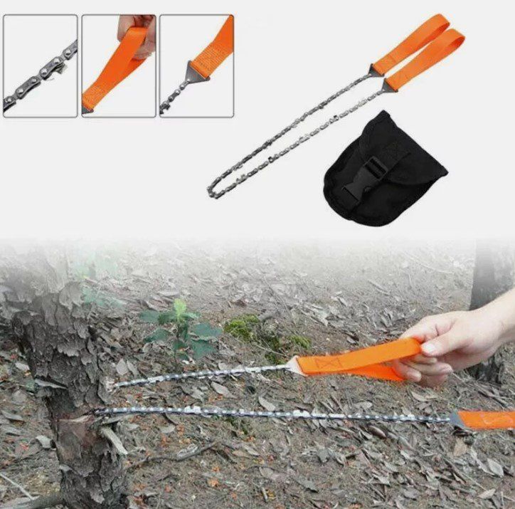 Diese handliche Kettensäge ist dein bester Freund bei Outdoor-Abenteuern! Mit nur 145 Gramm wiegt sie fast nichts, passt in jeden Rucksack und ist doch erstaunlich leistungsstark. Aus hochwertigem Manganstahl gefertigt, schneidet sie sich problemlos durch Brennholz - perfekt fürs Lagerfeuer beim Camping. Die Gesamtlänge von 103 cm (Sägelänge 63 cm) gibt dir genug Hebelkraft, ohne dass du dich verausgaben musst. Das vibrationsarme Design macht die Arbeit angenehm, und die orangenen Griffe aus Nylon liegen gut in der Hand. Einfach die beiden Griffe nehmen, die Kette straff ziehen und mit gleichmäßigen Bewegungen sägen - schon hast du dein Feuerholz. Ideal für Wanderer, Angler, Jäger oder einfach für den Notfall im Auto. Wird in einer praktischen Tasche geliefert, die du am Gürtel befestigen kannst. Ein unverzichtbares Tool für alle, die gerne draußen unterwegs sind - leicht, robust und extrem effektiv!