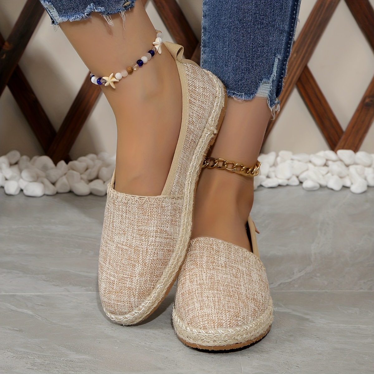 Ultimative Sommersonne für deine Füße! Diese Rengzun Espadrilles aus weicher Baumwolle-Leinen-Mischung sind die perfekten Begleiter für warme Tage. Superleicht und atmungsaktiv sorgen sie für ein angenehmes Tragegefühl den ganzen Tag lang. Einfach reinschlüpfen und loslaufen - der bequeme Slip-on Design macht's möglich. Mit nur 1cm Absatzhöhe und runder Zehenform sitzen sie wie angegossen. Perfekt für Spaziergänge, Einkaufstouren oder entspannte Café-Besuche. Wichtig: Die Schuhe fallen eher klein aus - im Zweifel einfach eine Nummer größer bestellen! Verfügbar in den Größen 34-40 mit detaillierten Fußlängen-Angaben zur perfekten Passform. Die Gummisohle gibt guten Halt, während das Synthetik-Innenfutter für zusätzlichen Komfort sorgt. Stylisch, elegant und superpraktisch - genau das, was du für den Frühling, Sommer und Herbst brauchst!