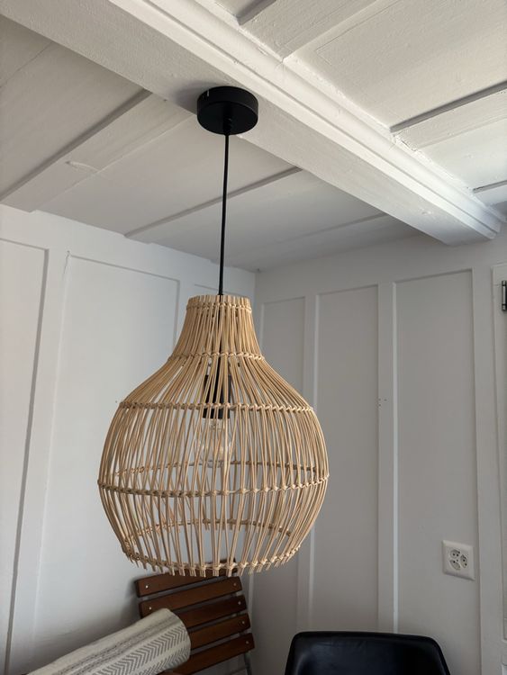 Boah, diese Hängeleuchte von Methedeeco ist einfach ein Traum! Der handgewebte Bambus-Ring und der elfenbeinfarbene Leinen-Schirm verbreiten sofort diese typische Boho-Atmosphäre, die einfach jeder liebt.\\n\\nKomplett handgefertigt - da steckt echte Liebe zum Detail drin! Der hochwertige Stoff ist viel langlebiger als diese typischen Papier-Laternen und verbreitet ein super weiches, gemütliches Licht.\\n\\nMit 4 Meter Kabellänge hast du genug Spielraum, um die Lampe genau dort aufzuhängen, wo sie am besten wirkt. Und das beste: Sie hat einen normalen Stecker - kein aufwändiges Installieren mit Elektriker nötig!\\n\\nPerfekt für:\\n• Über dem Esstisch\\n• Im Wohnzimmer als Eyecatcher\\n• Im Schlafzimmer für gemütliches Licht\\n• Im Flur als Willkommens-Gruß\\n• In Restaurants oder Cafés\\n\\nKleiner Tipp: Wenn der Stoff nach dem Auspacken etwas Falten wirft - kein Stress! Einfach aufhängen und leicht mit Wasser besprühen. Nach 3-5 Tagen sind die Falten wie von Zauberhand verschwunden.\\n\\nDie Lampe verströmt diesen Zen-artigen, entspannenden Effekt und macht jeden Raum sofort wohnlicher. Wenn du auf natürliche Materialien und handgefertigte Qualität stehst, bist du hier goldrichtig!\\n\\nÜbrigens: Die Glühbirne ist nicht dabei - du kannst aber jede Standard-Glühbirne deiner Wahl verwenden. Einfach aussuchen, reinschrauben und schon strahlt dein Zuhause in neuem Licht!