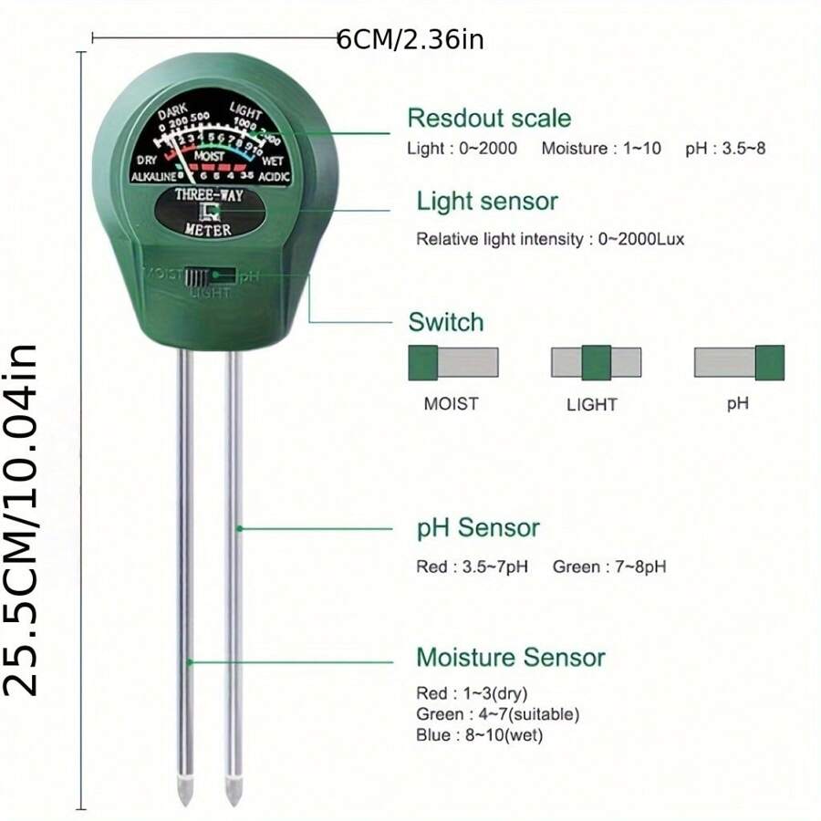 Willst du wissen, was deine Pflanzen wirklich brauchen? Dieser praktische 3-in-1 Bodentester verrät es dir! Einfach in die Erde stecken und sofort siehst du auf der Skala: Bodenfeuchtigkeit (1-10), PH-Wert (3,5-8) und Lichtintensität (0-2000 Lumen). Das Beste: Keine Batterien nötig - das Gerät funktioniert komplett mechanisch. Die Doppelsonden aus aluminiumbeschichtetem Kupfer liefern zuverlässige Messergebnisse. Super praktisch für Garten, Balkon oder Gewächshaus. So vermeidest du Überwässerung und erkennst Nährstoffmangel rechtzeitig. Kompakt und leicht passt der Tester in jede Gartentasche. Einfach nach Gebrauch abwischen - schon ist er wieder einsatzbereit. Wichtig: Nicht in Flüssigkeiten tauchen und nicht für sandige Böden verwenden. Ob für Blumenbeete, Gemüsegarten oder Rasen - mit diesem Helferlein werden deine Pflanzen dich lieben!